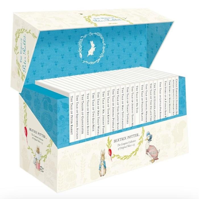 Beautiful gift box containing all 23 original Peter Rabbit books. Loved the world over for a century, each little book takes you deep into the English countryside as you become familiar with Beatrix Potter's famous and (mostly!) lovable characters, from naughty Peter Rabbit himself, to tidy Mrs Tittlemouse and unlucky Jeremy Fisher. Each tale with its soft water-colour artwork will delight and charm adults and children alike. Which is your favourite?
