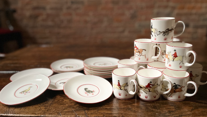 A set of 12 coffee cans and saucers painted by Priscilla Spicer