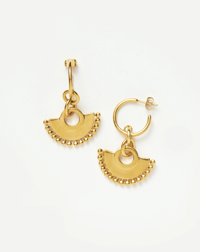 Everyday statement hoop earrings inspired by Colombia, featuring bobble-trimmed charms suspended from delicate hoops in 18ct gold plating. Add to your ear stack with chunky gold huggies or pair with the Zenyu Fan Necklace. As seen in The White Lotus.