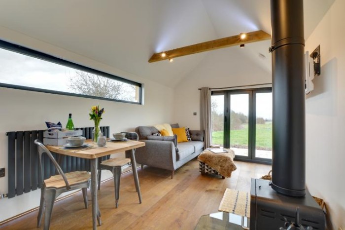 Seating Area has wood flooring, sofa and footstool, occasional table, Smart TV with Netflix, wood burning stove, double bi-folding doors. Dining table with seating for 2