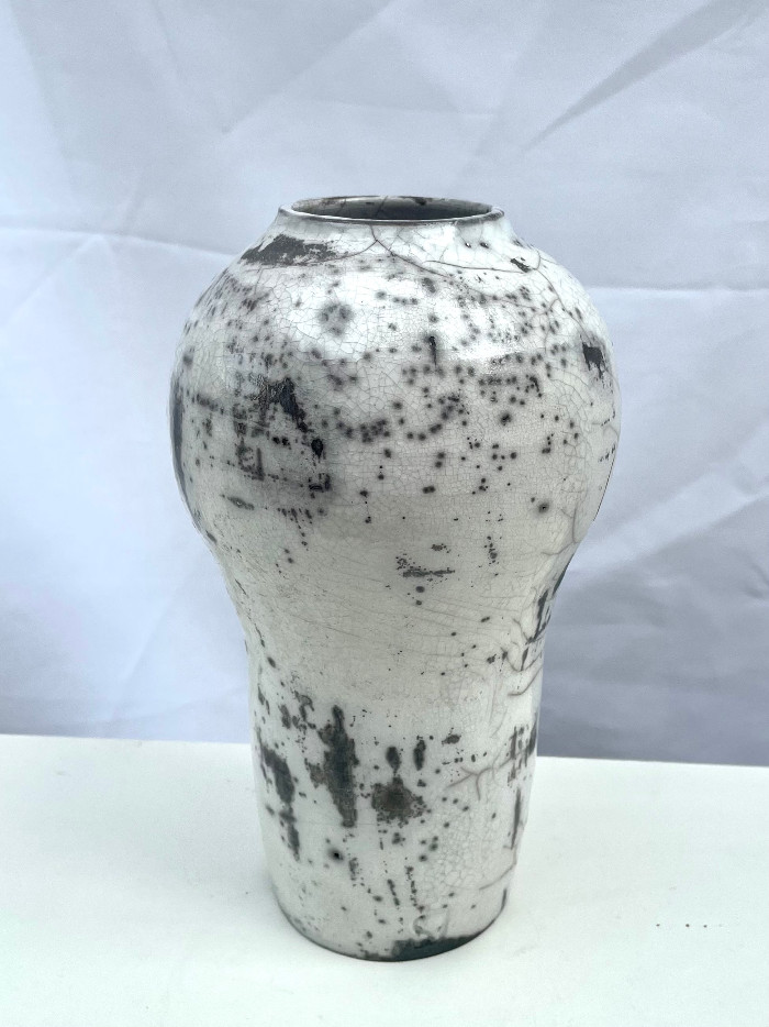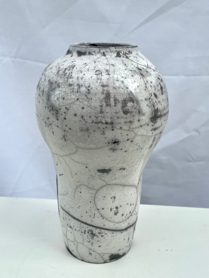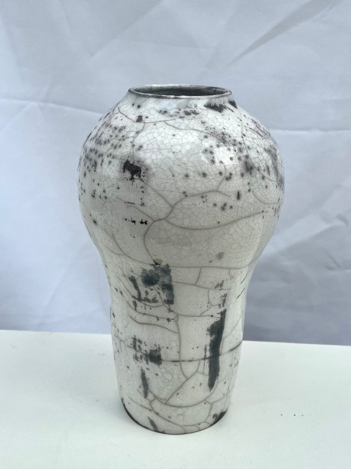 This jar was thrown on the wheel, bisque fired then a clear glaze applied and fired in a raku kiln which yields an absolutely unique surface to each pot. It is 22cm high. Usual selling price: £90