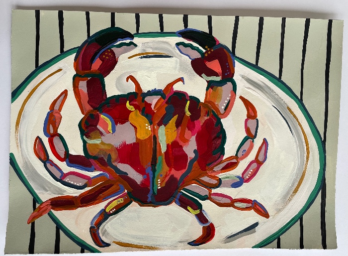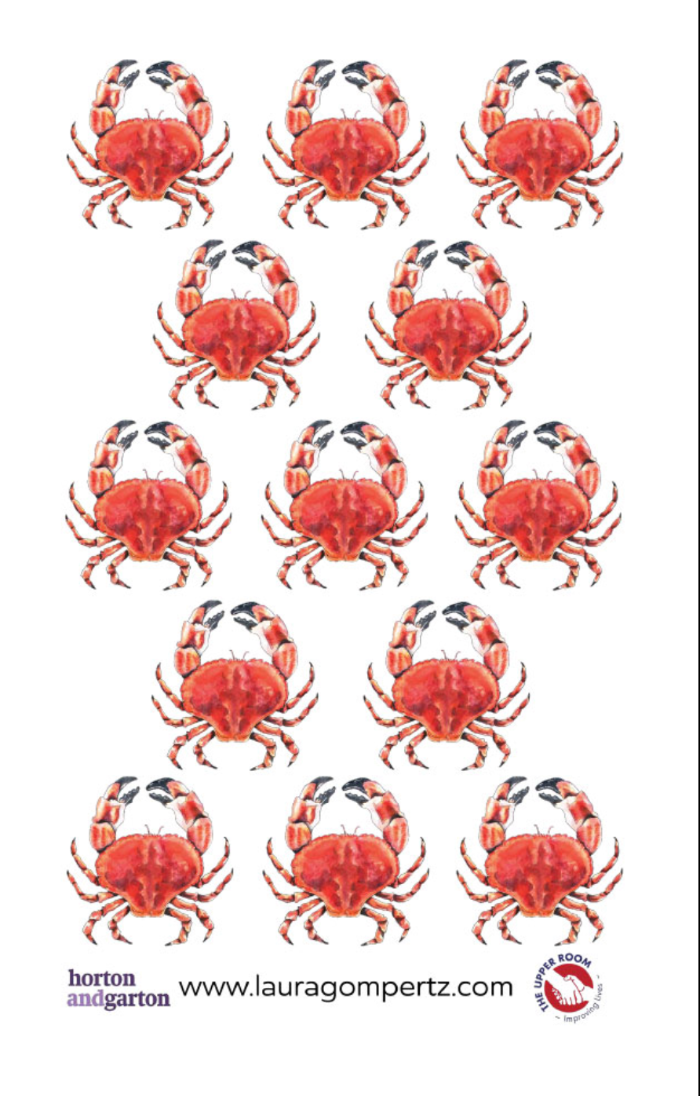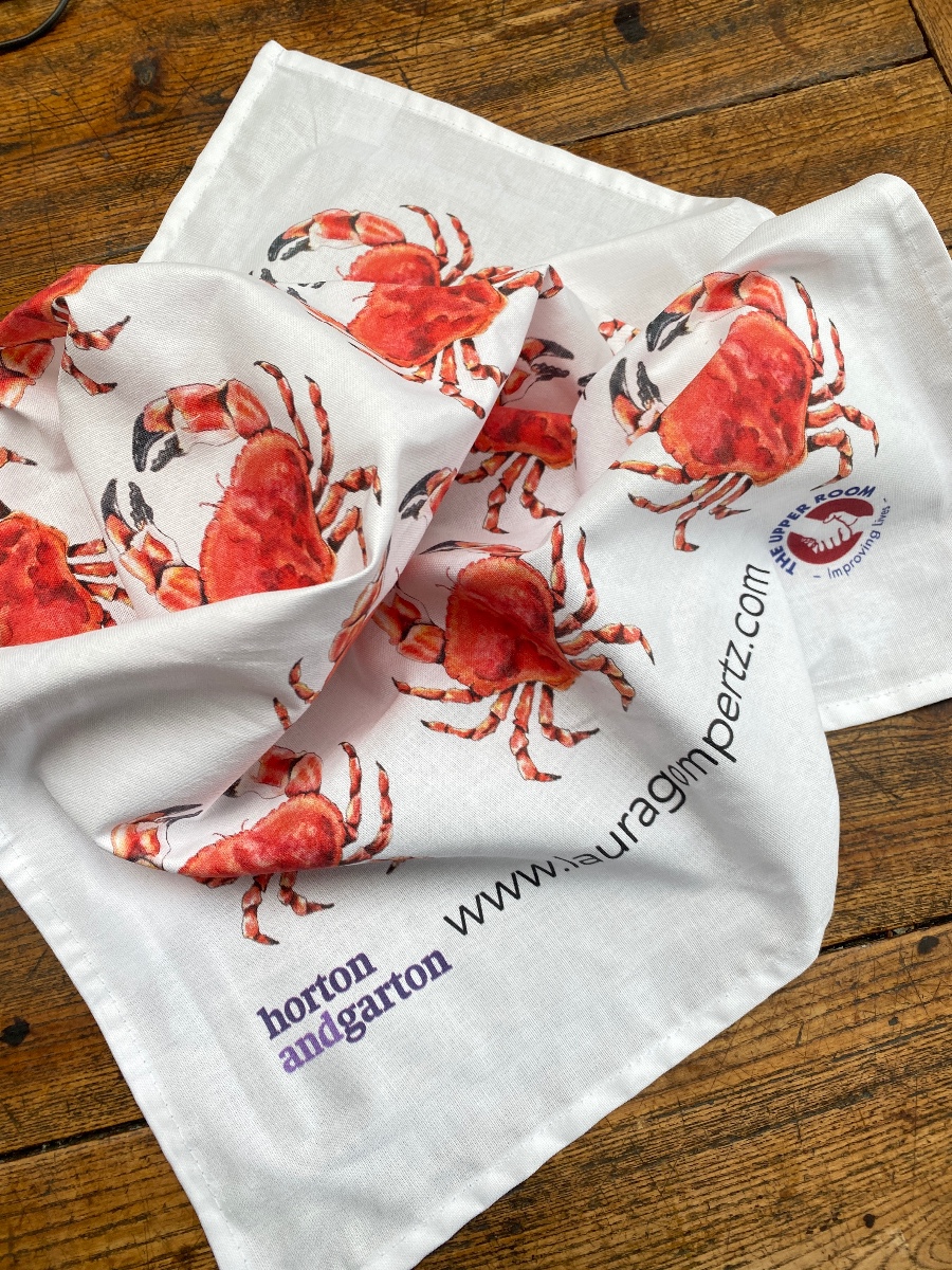 Cotton tea towel in aid of The Upper Room with crab design by Laura Gompertz. Buy it now price £12