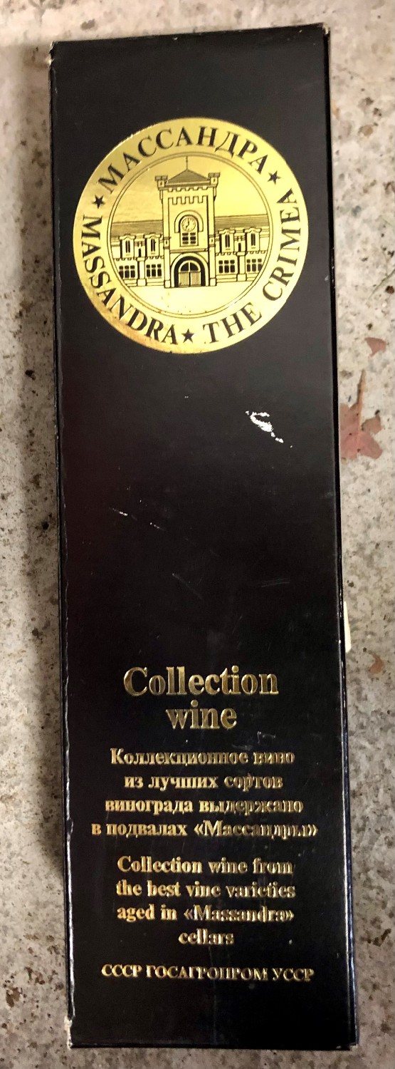The wine is packed in its original carton and is wrapped in torn cellophane. It was part of a case purchased at Sotheby’s first auction dedicated to the Massandra Collection in 1990, stored initially in a cellar and then in a Eurocave. David Molyneux-Berry MW, then director of Sotheby’s, had spent several days in the Massandra cellars tasting through the massive lots and arranged for the bottles to be re-corked and packed individually in cartons before shipping and staging this auction, the first of several over subsequent years.
