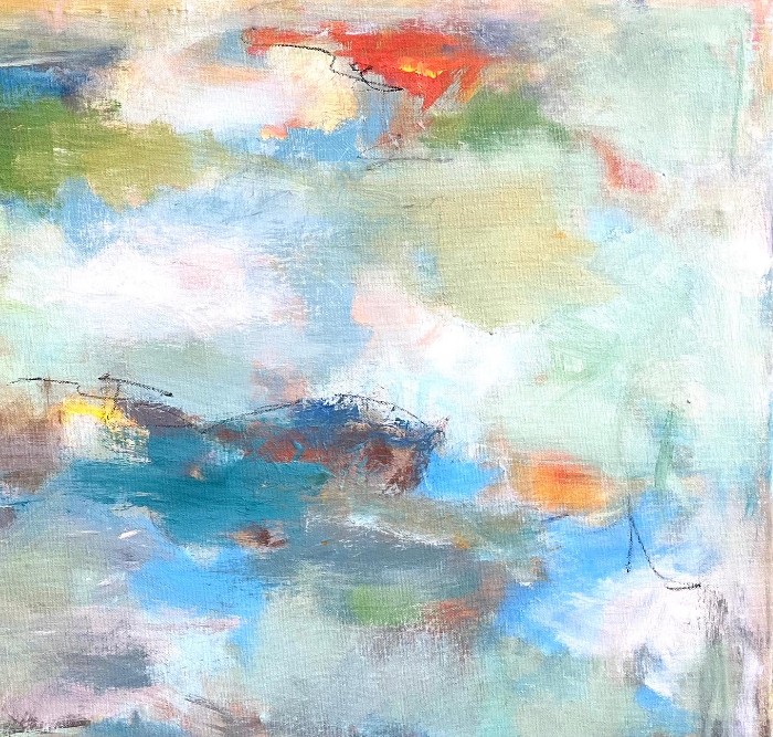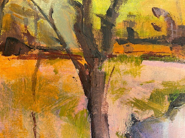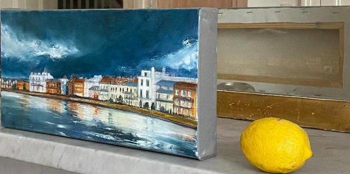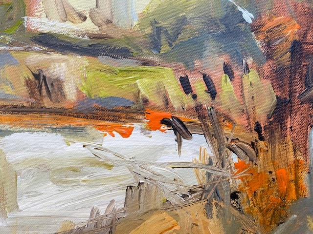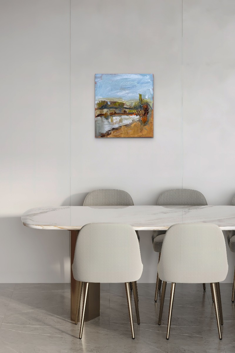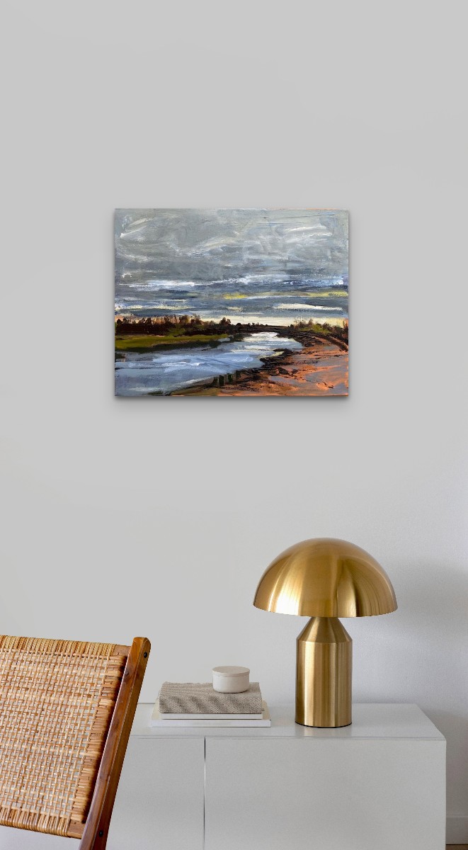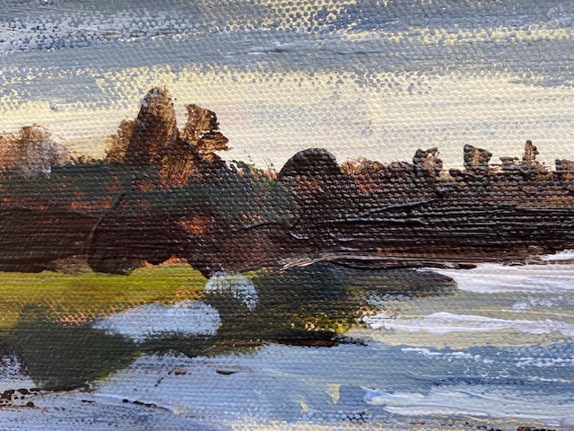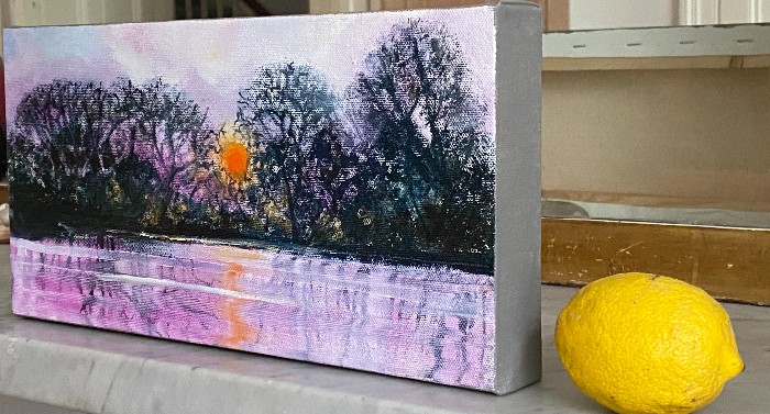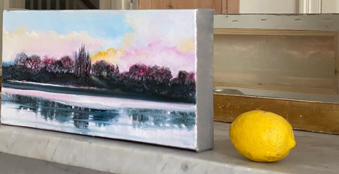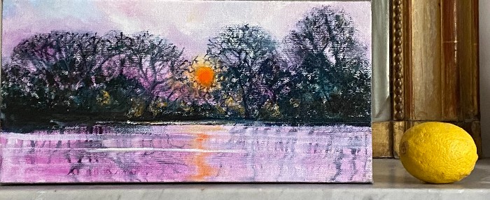 A memento of late afternoon walking from Putney bridge to Chiswick. Oil on deep edge canvas. Edges are painted grey. Dimensions: height 15cm: width 30cm: depth 4cm. Unframed.