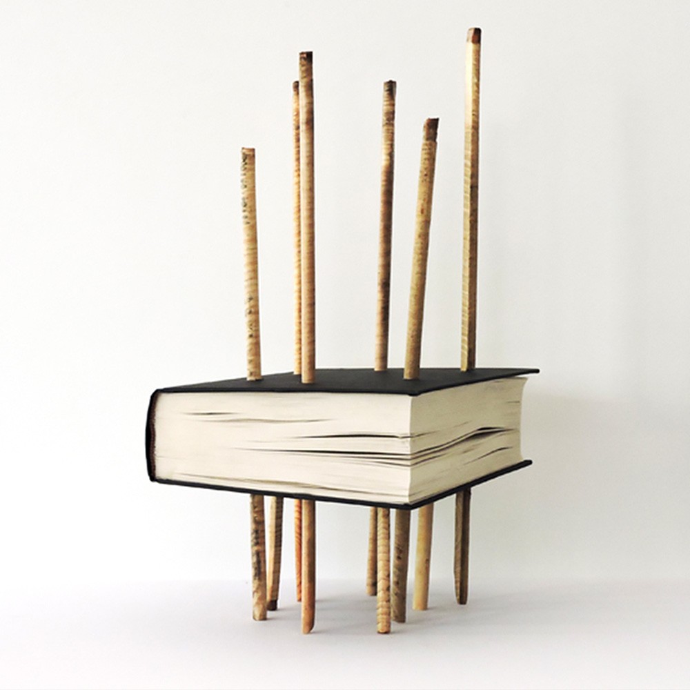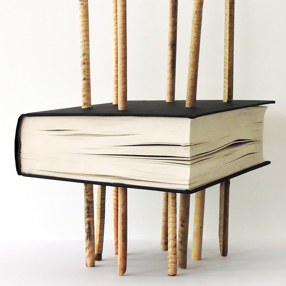 This photo is of a sculpture comprising a hardbacked book with tree cores inserted in holes drilled by John Bailey. The horizontal cores are taken from living trees and the sampling doesn’t harm them. As a cross-section they represent the complete life of the tree and its growth rings to date. Each one which tells the story of a year and reflects the prevailing environmental conditions. The cores were taken for Edwina fitzPatrick’s work ‘Archive of the Trees’ https://www.forestryengland.uk/the-archive-the-trees My thanks to Edwina for her permission to use them in my work, and to the UK Oak Project for providing them https://www.oak-research.co.uk