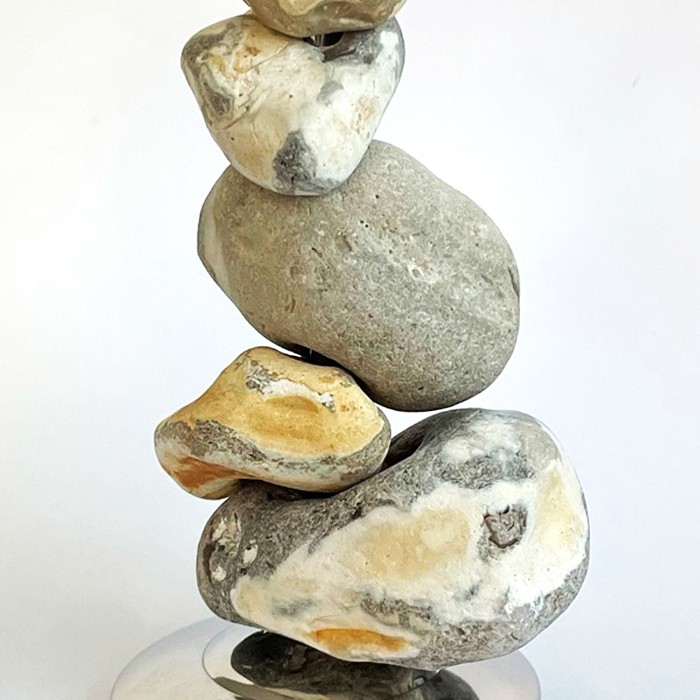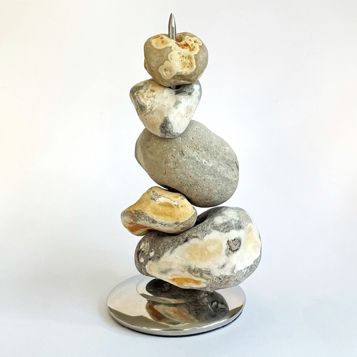 This photo is of a sculpture comprising stones with holes on a metal spindle. The holes are made over centuries by molluscs such as the Common Piddock which bore them to make their homes. The spindle is a device using in restaurants and newsrooms to spike pieces of paper such as orders, receipts, and stories.