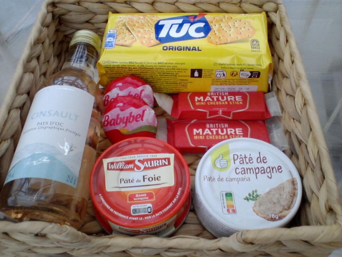Pates & small cheeses all in a wicker napkin tray.