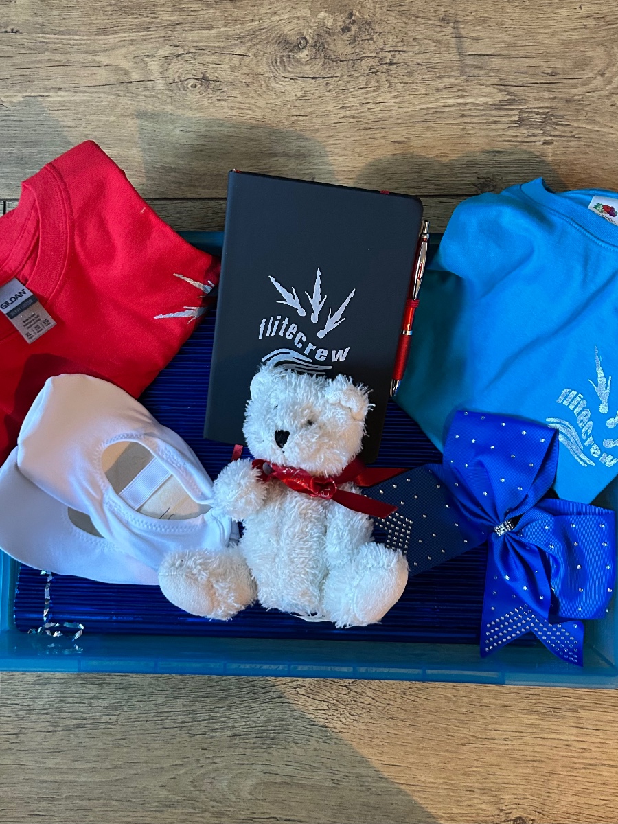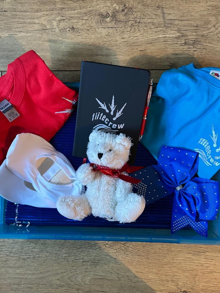EITHER - TRAMPOLINE BUNDLE - Red Trampoline T-shirt / Trampoline Shoes / Flitecrew Notebook / Flitecrew Teddy OR CHEER BUNDLE - Blue Cheer T-Shirt / Training Bow / Flitecrew Notebook/ Flitecrew Teddy
