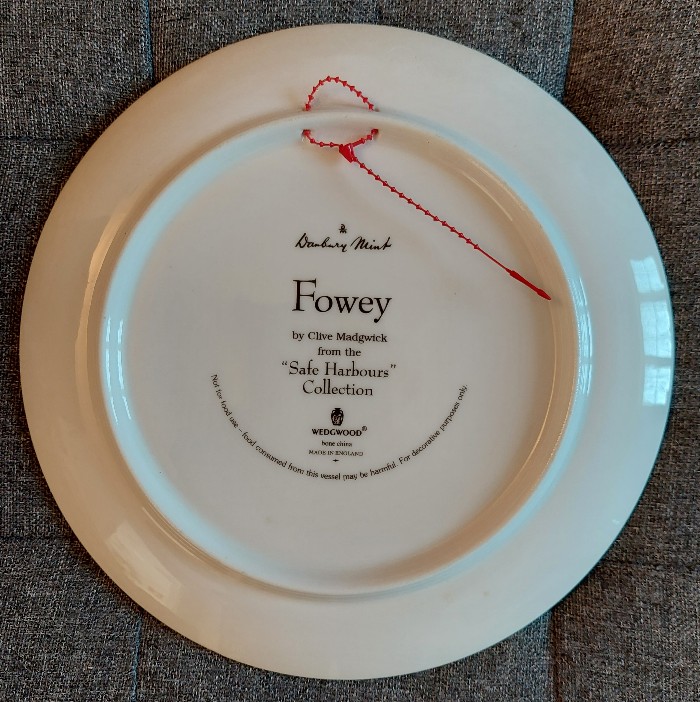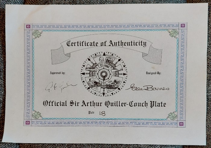 A decorative bone china plate, boxed and with a certificate of authenticity. Designed by Eileen Barnes to commemorate Sir Arthur Quiller-Couch. Number 18 of a limited edition. Designed and produced for sale during the earliest years of the Daphne du Maurier Festival, now difficult to find. Very Good condition. 22cm in diameter.
