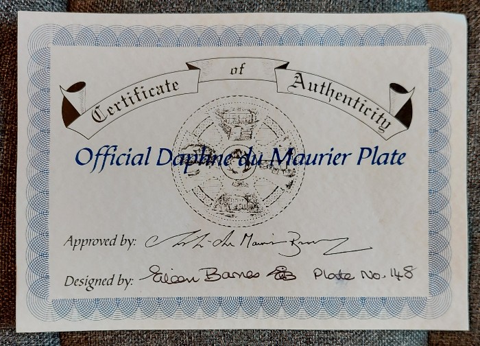 A decorative bone china plate, boxed and with a certificate of authenticity. Designed by Eileen Barnes to commemorate Daphne du Maurier. Number 148 of a limited edition. Designed and produced for sale during the earliest years of the Daphne du Maurier Festival, now difficult to find. Very Good condition. 22cm in diameter.