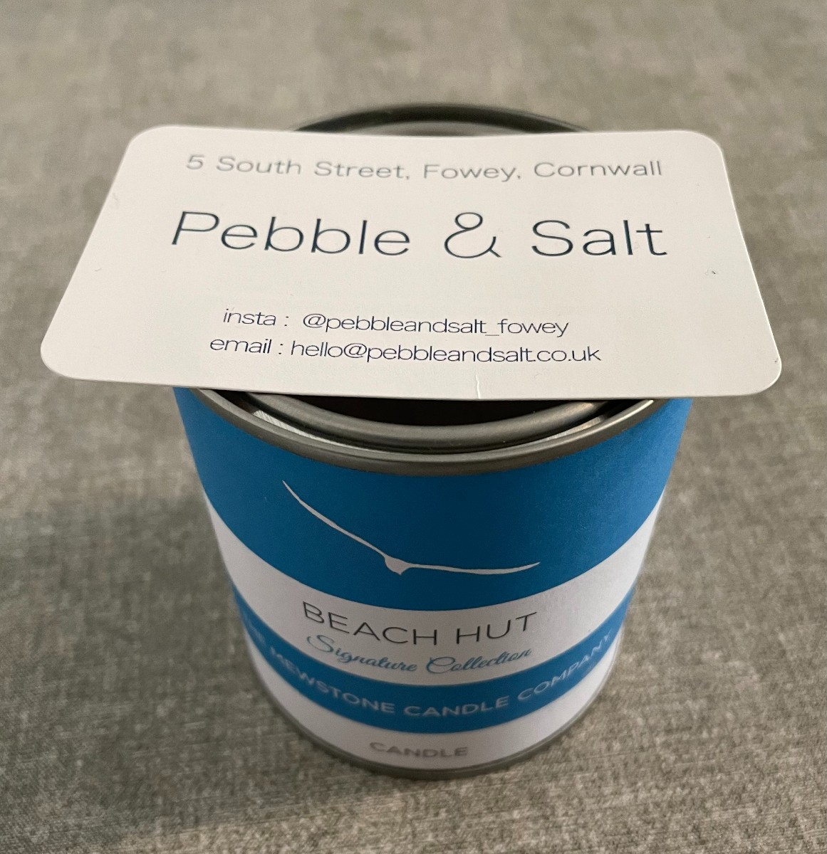 A5 premium, handmade, artisan sketchbook, with sea pebble beach design. Blue book cloth spine, blue, grey and pale wood design, with pebble, waves, hearts, shell motifs. Blue and white spine headband, blue ribbon bookmark. Handmade art sketchbook, with 96 blank pages of premium white cartridge paper, made in the UK. The paper is suitable for sketching and dry media. The book and binding are completely handmade in Cornwall. 22cm x 13.5cm.