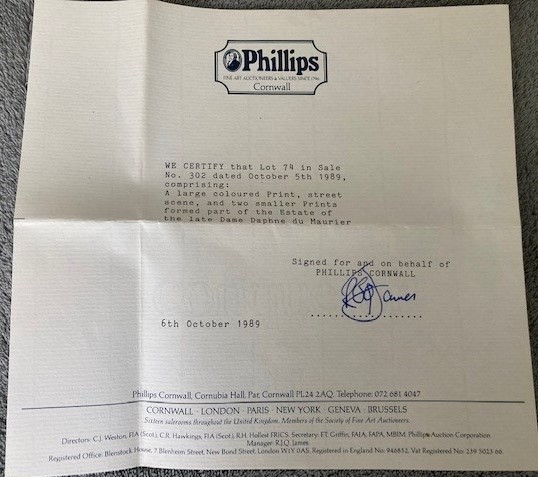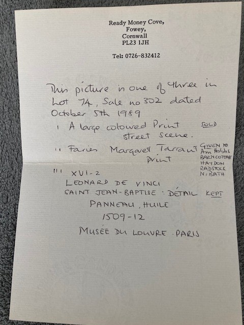 A framed print of Leonardo da Vinci’s Saint Jean Baptiste. This picture was once owned by Daphne du Maurier and formed part of Lot 74 in Phillips Sale no 302 on 5th October 1989. A certificate of the sale is attached to the picture. The picture measures 24 x 20cm. An auctioneers estimate of the sale price is £100 - £150.