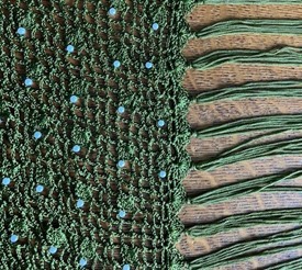 A very attractive sage green evening shawl with a crochet scallop shell design embellished with pearl type beads. The shawl is triangular in shape with a long (approx 18cm) tasselled fringe. The shawl is approx. 145cm wide. Made for the John Lewis partnership this is item is brand new.