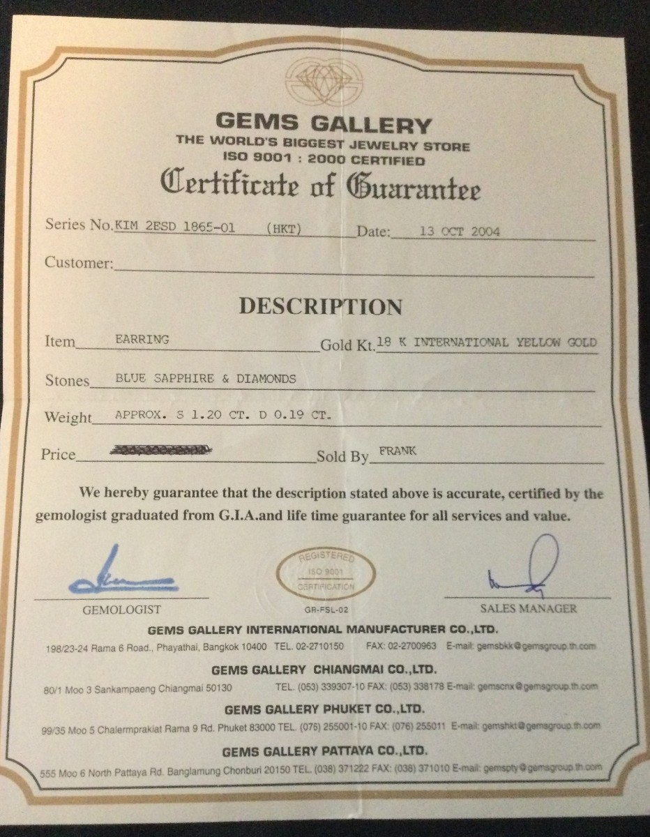 A pair of flower shaped studs with 4 sapphires around a diamond in the centre, and a further 3 diamonds on the flower stem. Hallmarked 18ct yellow gold. Valued in 2008 at £190 and comes with a Certificate of Guarantee. 1cm in size.
