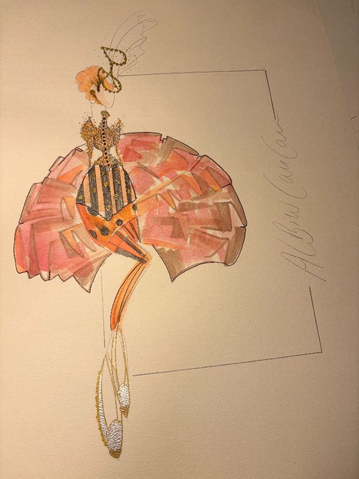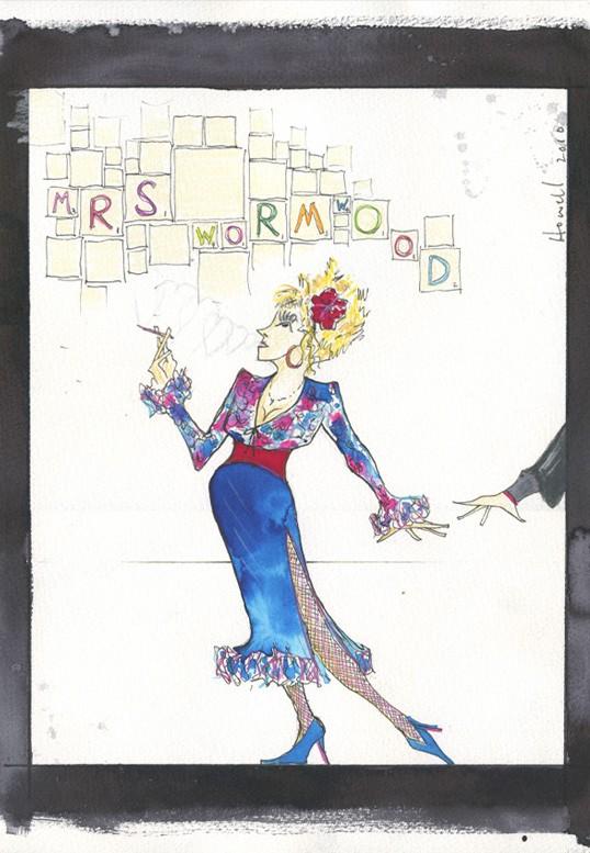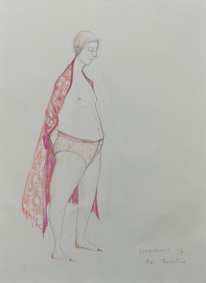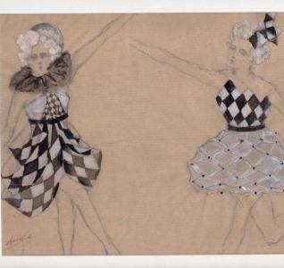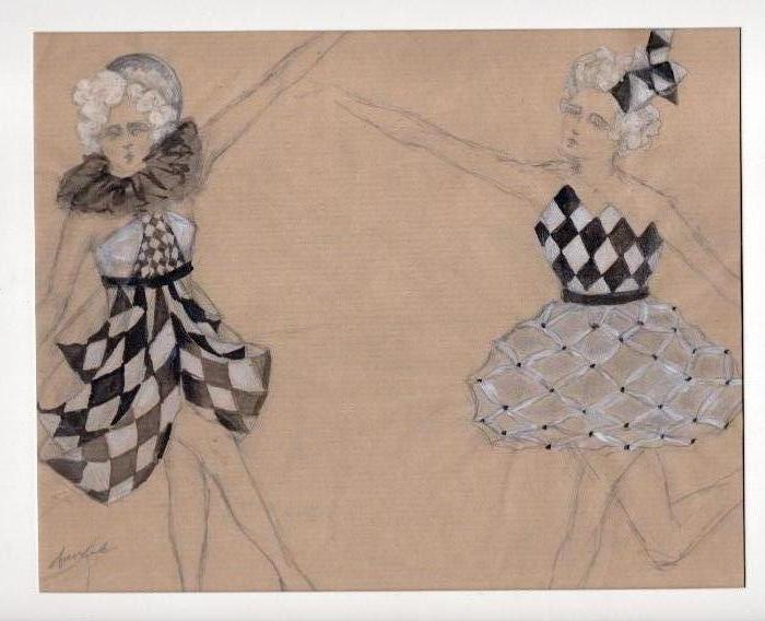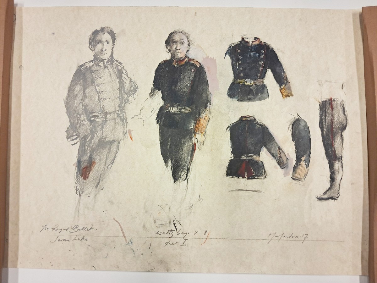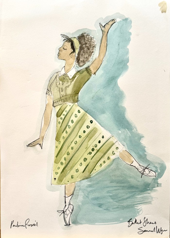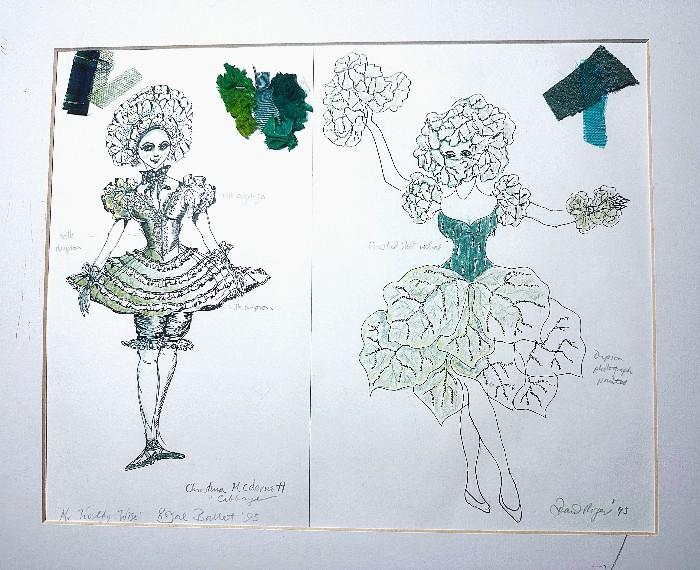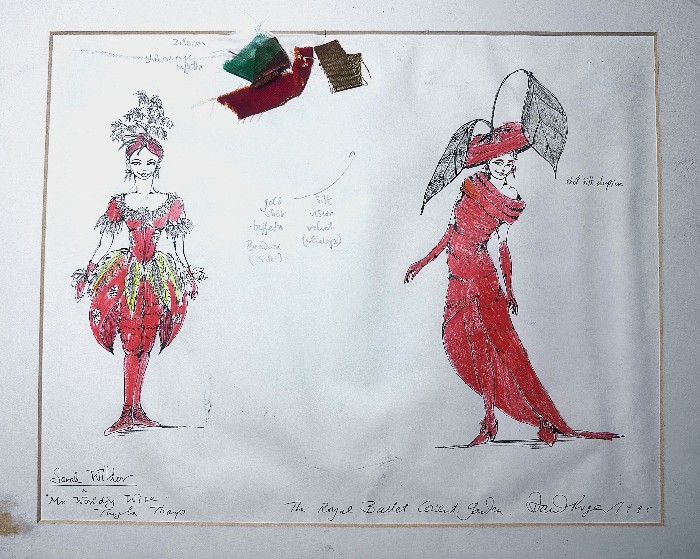 Hand drawn costume drawing for Zenaida Yanowsky in Twyla Tharp ‘s 'Mr Worldly Wise', Royal Ballet 1995.