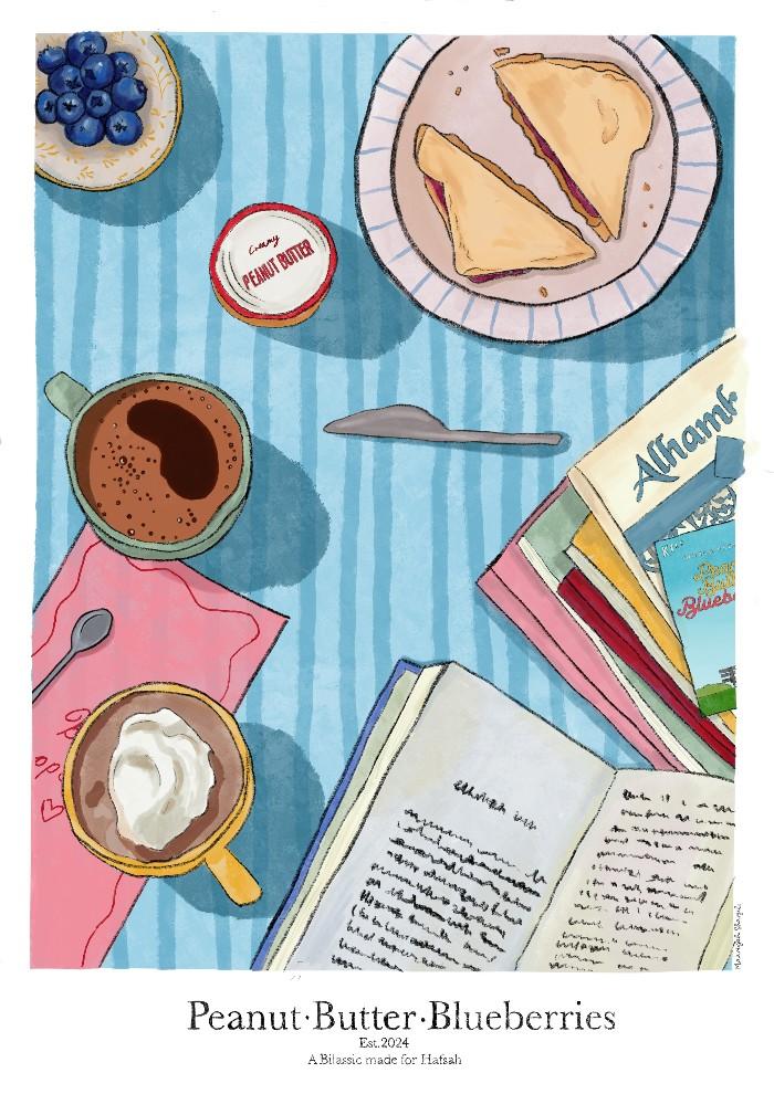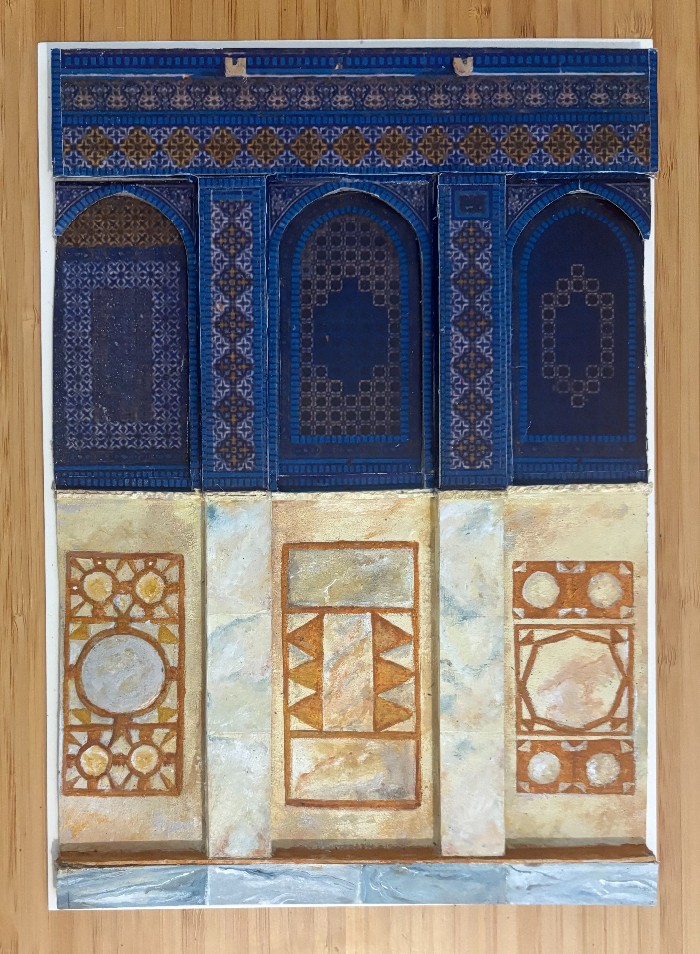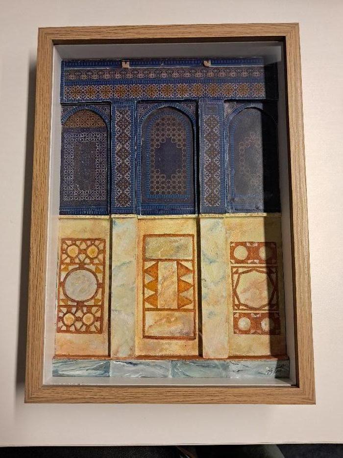 When making this print I was thinking of my friend Zainah’s love of the colour & smell of fresh oranges picked in the gardens of her home town, Tulkarem & how that contrasts with the rich blue of the pottery and glassware of Al Quds & Al Khalil. The orange and blue is a joyful colour combination that celebrates these symbols of existence and resistance.