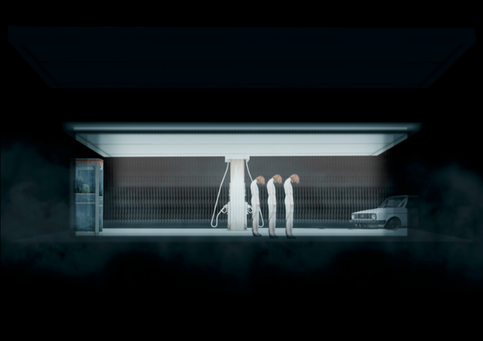 Concept art for the Liquor Store Black Void scene from 'Stranger Things: The First Shadow', designed by Miriam Buether, digitally drawn by Anya Allin based on the set model, Phoenix Theatre London West End and Marquis Theatre on Broadway NYC. Directed by Stephen Daldry and Justin Martin.