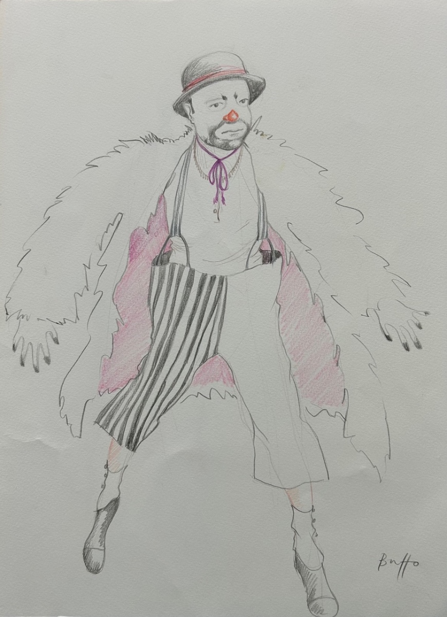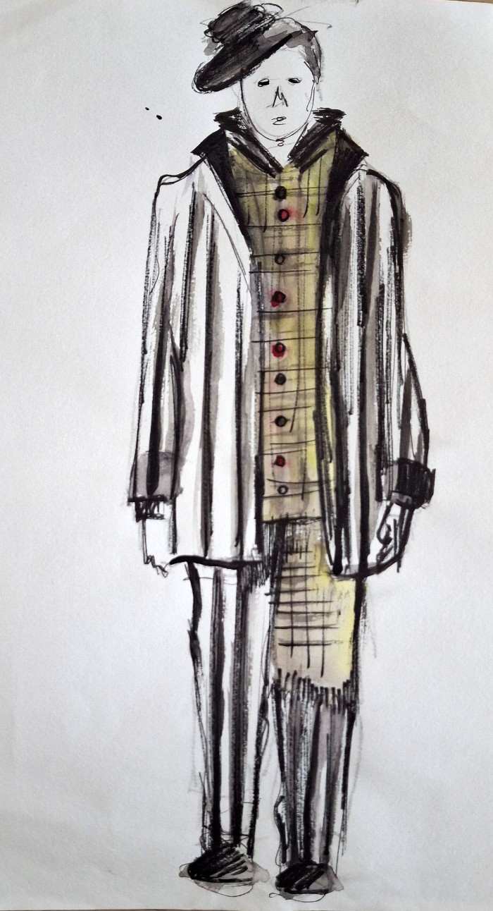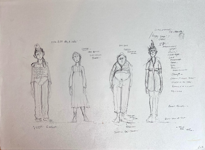 Two Pencil sketchbook drawings of initial ideas of Carnival Costume characters for Berlioz’s Benvenuto Cellini. Carnival Overture. Benvenuto Cellini by Berlioz, directed by Terry Gilliam. 2014. ENO - English National Opera.