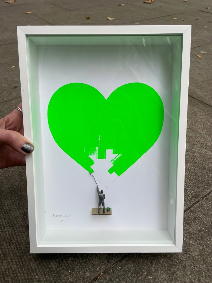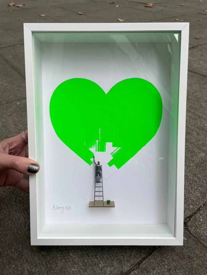 A4 Screen painted heart in fluorescent green with miniature hand-painted painter by Alex Berry.