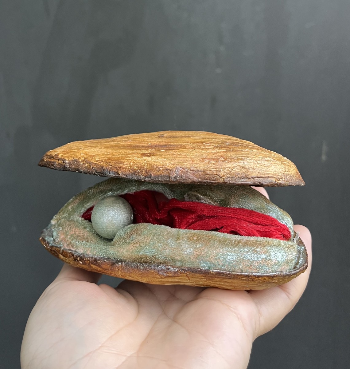 This vagina clam puppet was made as part of a puppetry performance at the Antony Hopkins Courtyard in response to artist Beatriz Santiago Munoz. It was part of an exploration of sensuality and paying attention through puppetry. It has a hole cut out the bottom for what was a spray gun. It can be used with a spray gun to make a squirting clam, or as a display object.