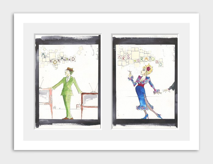 Two prints. Mr and Mrs Wormwood. Mounted and framed. Overall size A3. Will sign specifically for the highest bidder.