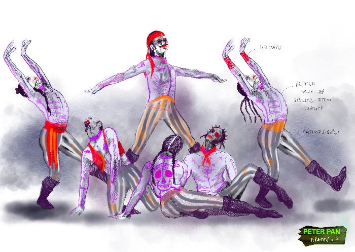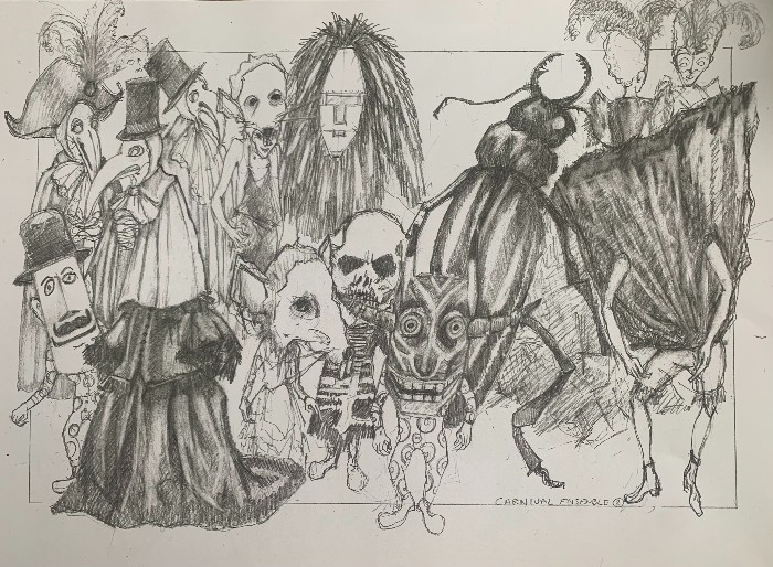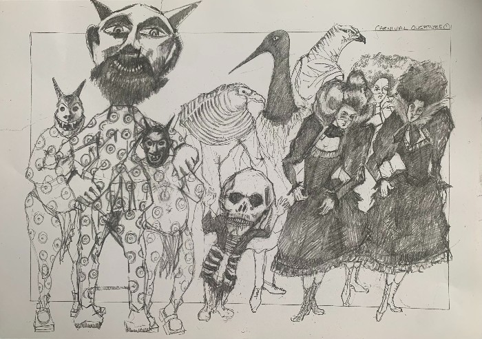 Taken from my sketchbook I was trying to work out the juxtaposition of carnival images and characters that would create the energetic sense of chaos a Carnival can have. Pagan, Festive and Theatrical.