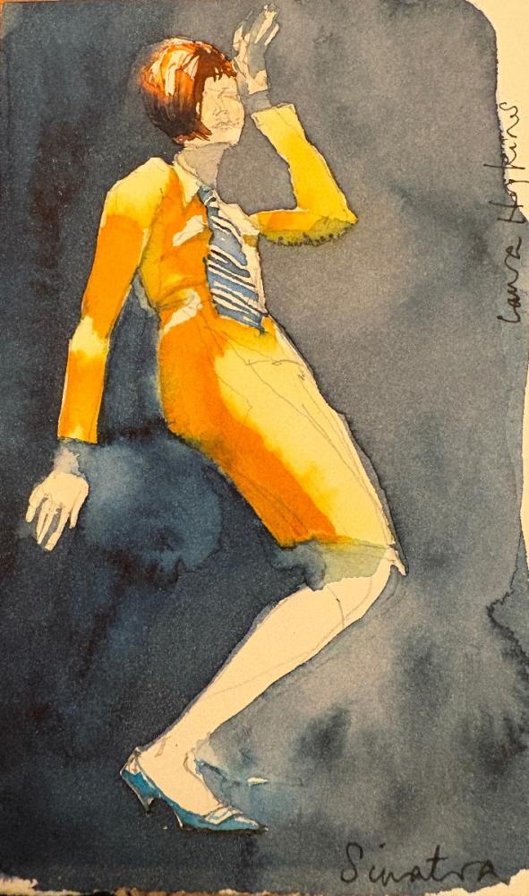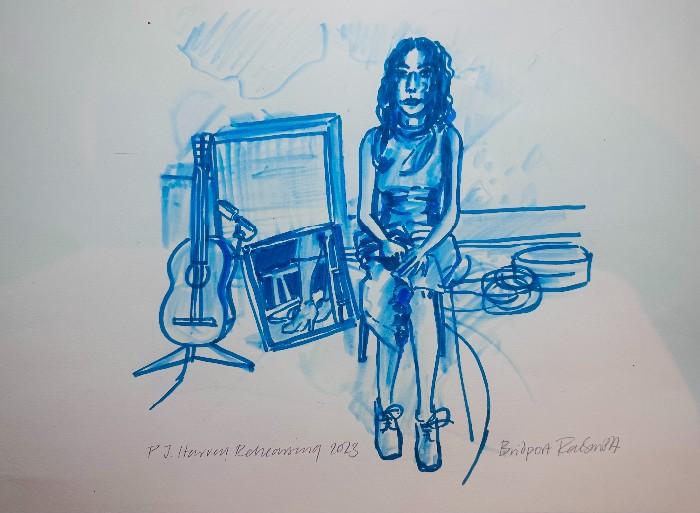 Felt pen on paper drawing of PJ waiting to start rehearsing. Hand drawn 297 x 420mm P J Harvey is an incredible and inspiring artist, I am totally in awe … she rarely sits still but here she is for a few moments … waiting to go on … in rehearsals …with her rehearsal dress and shoes designed by her dear friend Todd Lynn… I’m designing the set