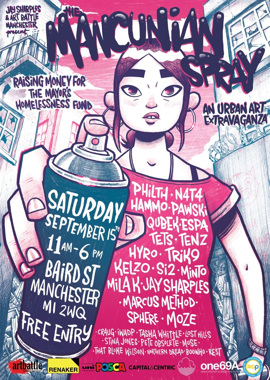 We held the Mancunian Spray on the 15th September and transformed a city centre car park into a stunning gallery of street art. Graffiti and street artists from around the country came together for the event and gave the public the chance to watch renowned artists at work.