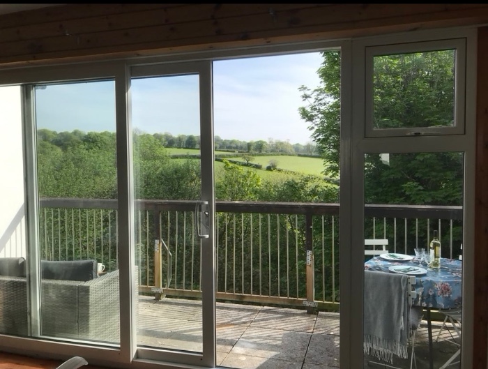 There is a spacious balcony, loads of walks and facilities. The house is 'upside down' to make the most of the views. 3 bedrooms, end terrace on a quiet corner of a holiday site. There is a children's play area a short walk from the house, tennis courts, on site pub.