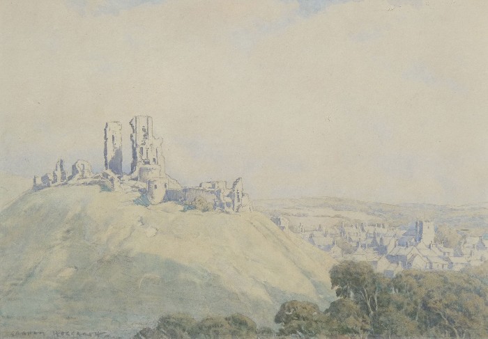 Arthur Henry Graham Hoggarth M.A., F.R.H.A. (1882-1964) Born in Kendal, he was a Watercolour & black & white artist. He was a Master & then Headmaster of Churcher's College, Petersfield, Hampshire. He contributed to "Punch" He exhibited from 1909-1935 at the Royal Academy, Royal Institute of Painter in Watercolours & Walker Art Gallery, Liverpool. Title: Corfe Castle, original watercolour framed & mounted ready to hang, image dimensions: 6.75" x 9.75"