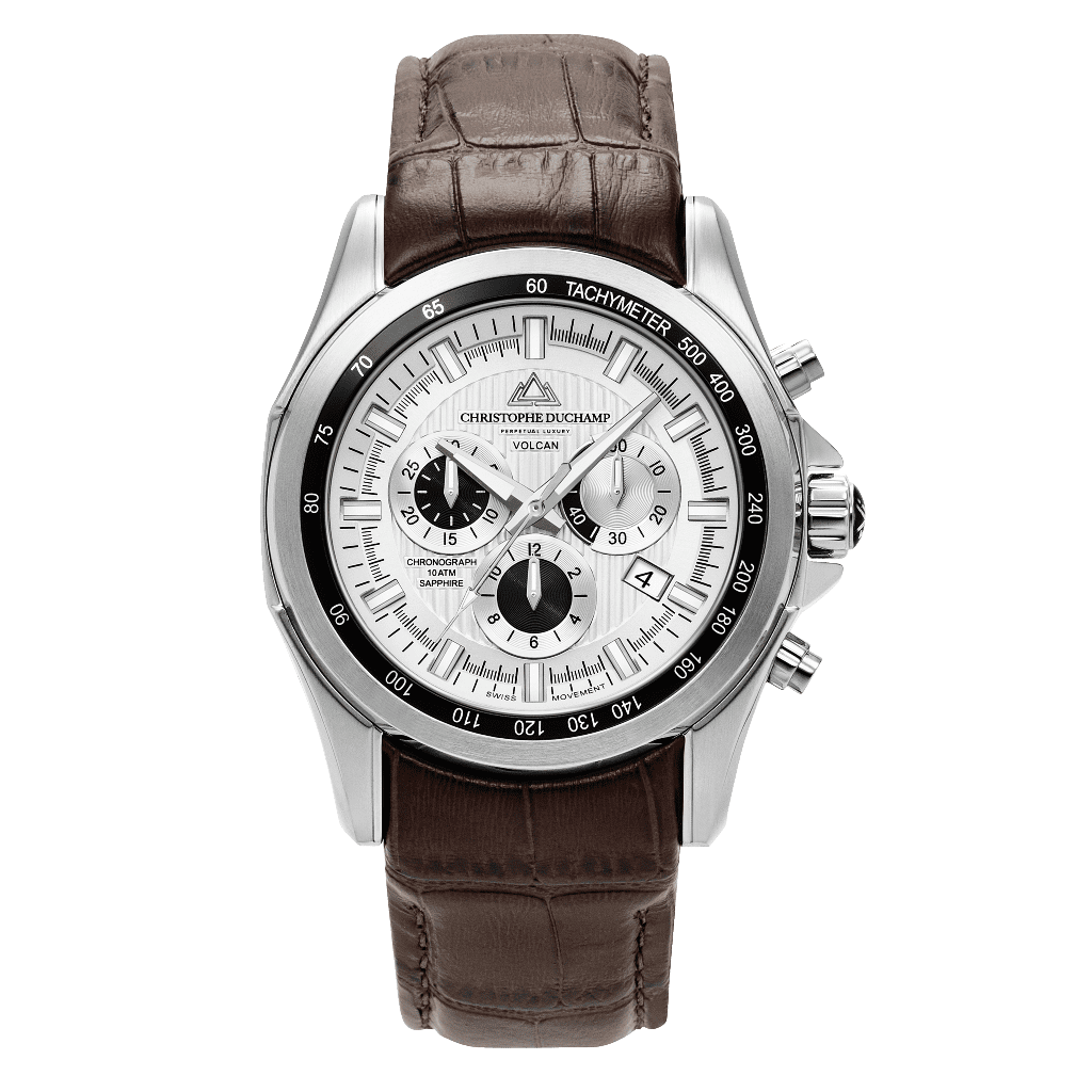 Christophe Duchamp Volcan Watch Silver Dial with Brown Italian Leather and Silver Case A combination of power and precision The Volcan Chronograph is the ultimate in functionality. Complimented perfectly with a real Italian leather strap The Volcan is the ultimate professional timepiece. Full details here https://christopheduchamp.com/product/cd7901-03/