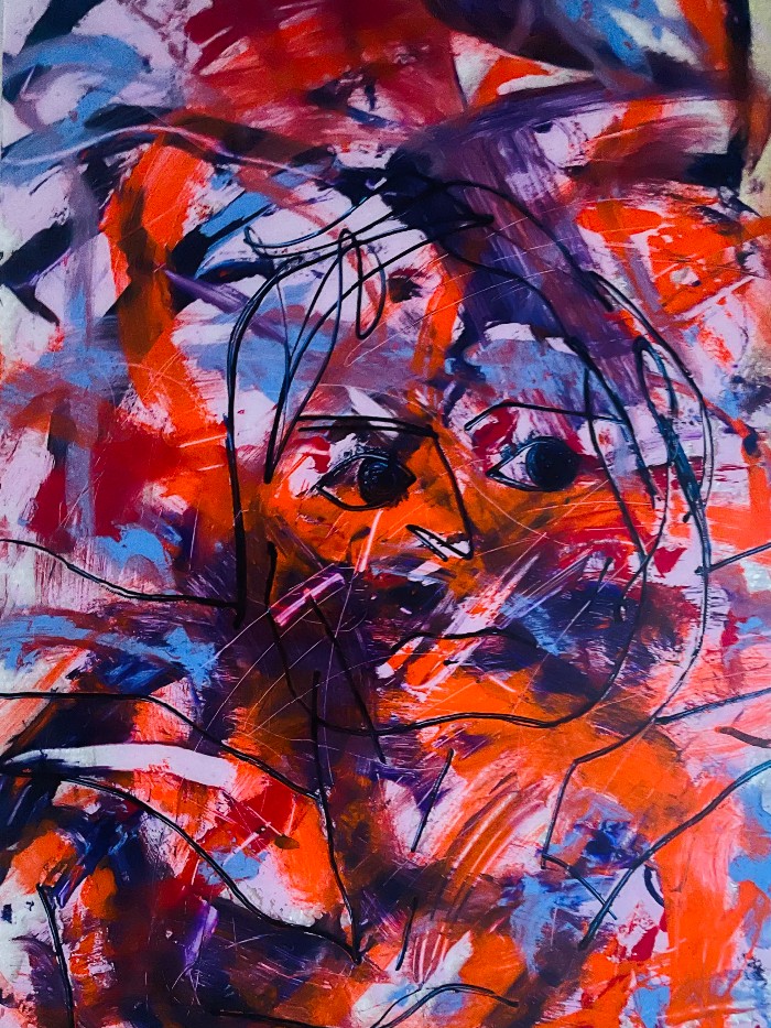 The bold, layered brushstrokes and vivid palette give the piece an emotional energy, while the glass surface adds depth and light.