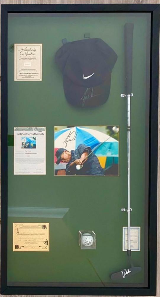 Tiger Woods – Beautiful memorabilia with his cap, club, ball and photo all individually signed, and with certificates of authenticity. 100 x54cm