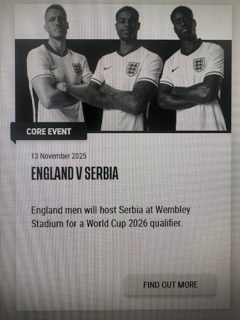 x4 Club Wembley Tickets for the World Cup 2026 Qualifier match between England & Serbia on Thursday 13th November 2026