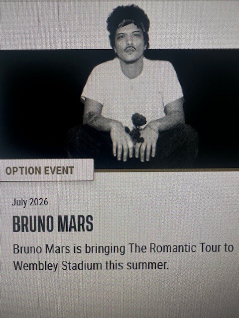 x2 Tickets to see Bruno Mars @ Wembley Stadium on Saturday 18th July 2026. Category 1, Club Wembley Seats, Block 223, Row 1 - Fantastic Seats!!!!!