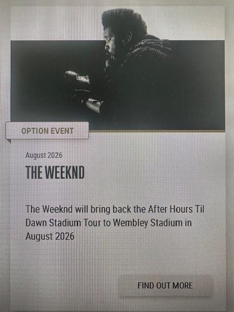 x4 Club Wembley tickets for The Weeknd @ Wembley Stadium on Friday 14th August 2026.