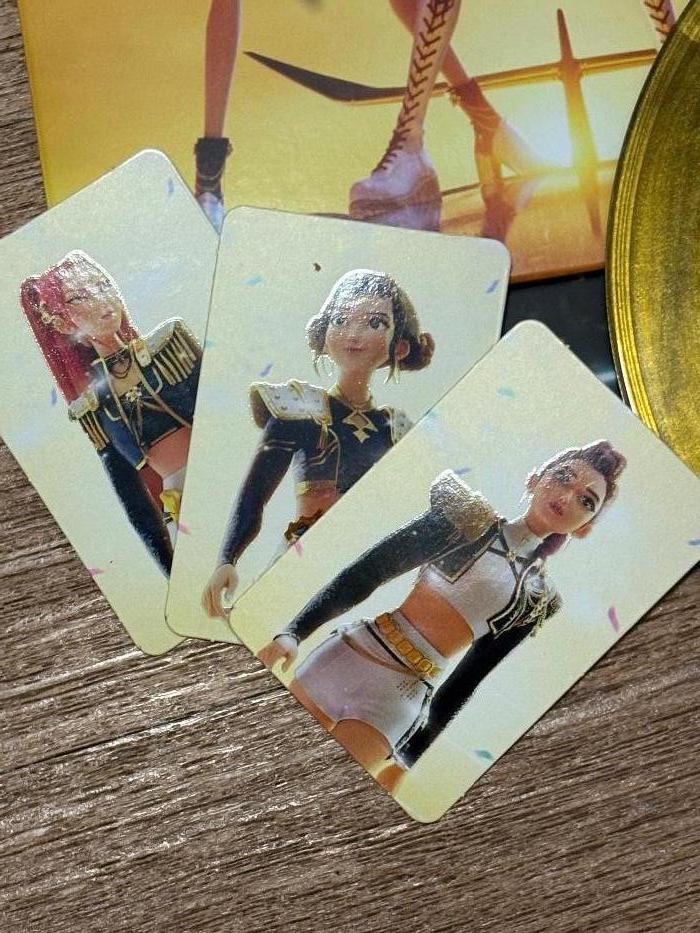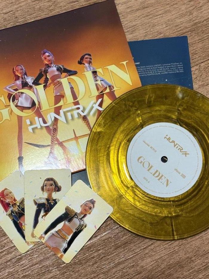 7” gold vinyl single of the smash hit, Golden, performed by Hunterix from the film, K-Pop Demon Hunters, with a set of three cards.