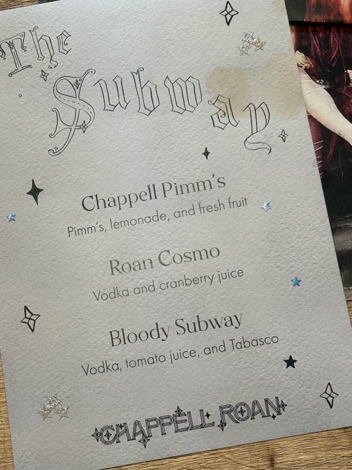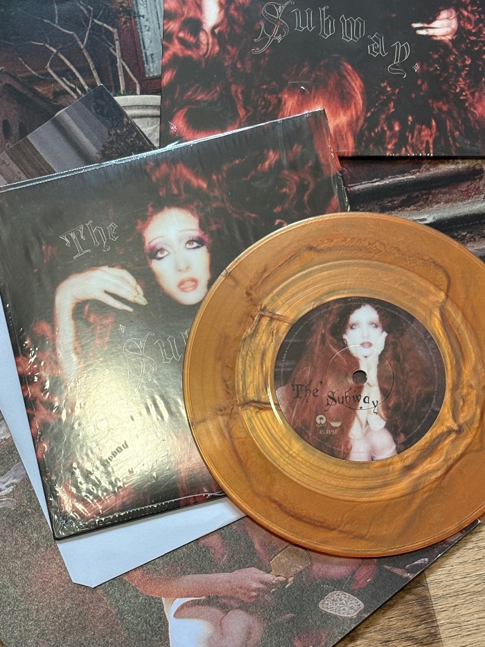 Bundle for Chappell’s 2025 single, The Subway, including 7” gold vinyl single, 7” lilac RSD single, double a side with The Giver, plus promo poster with drinks menu and coasters from London single launch event at The RVT
