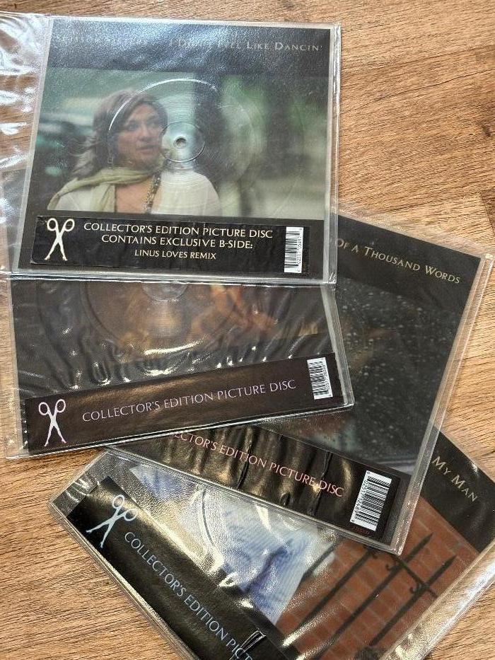 Set of four square 7” picture disc singles from the band’s 2006 alb Ta Da! The discs are in good conditions, there is a small amount of splits on some plastic sleeves.
