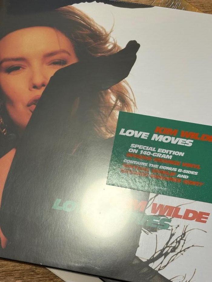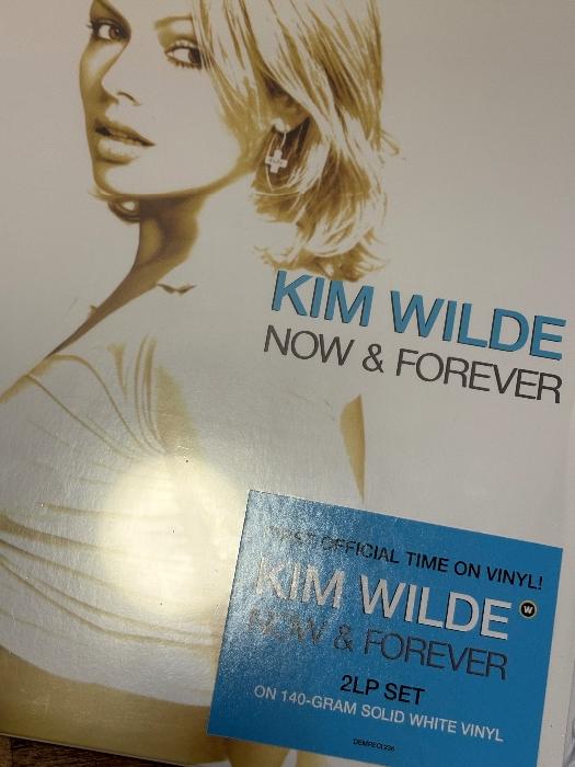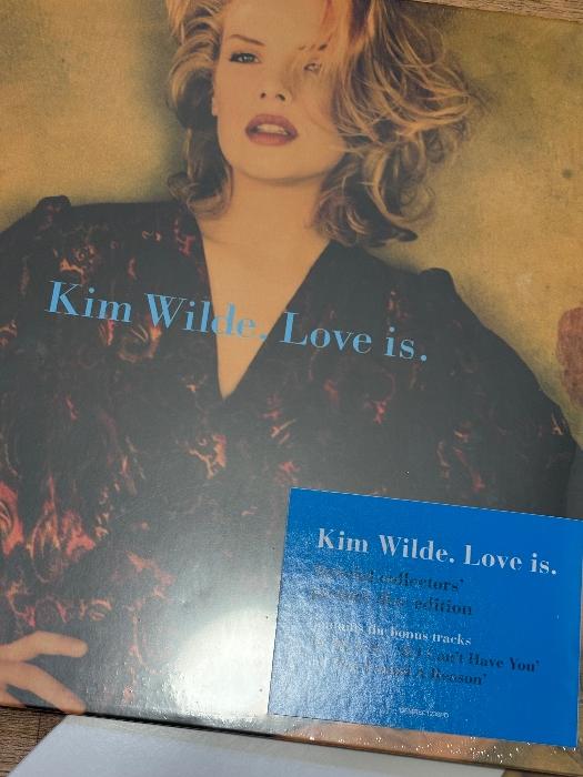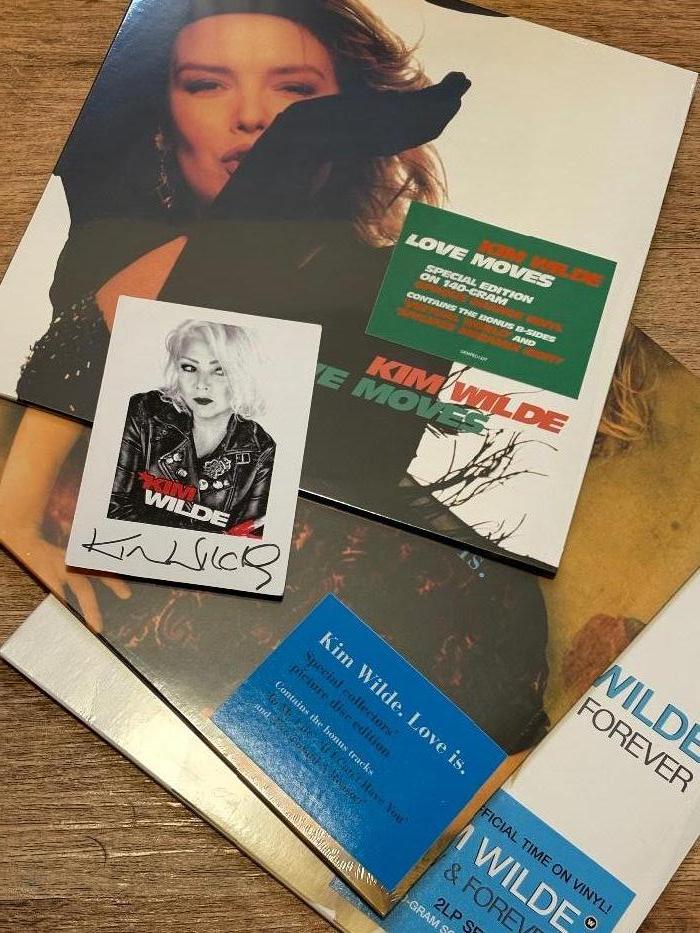 Three Kim Wilde albums, Love Moves Orange vinyl, Love is picture disc, Now and Forever double white vinyl plus a signed photo card.