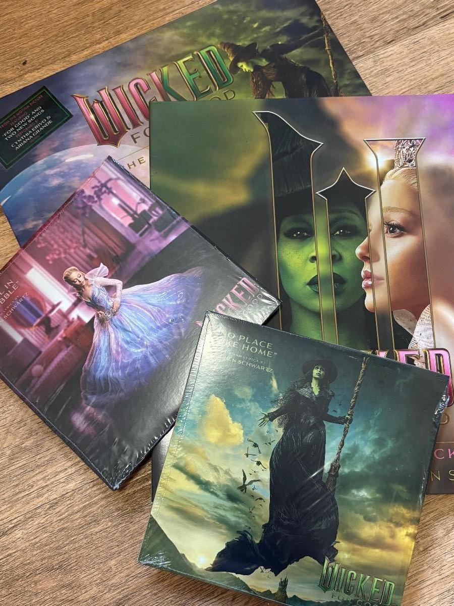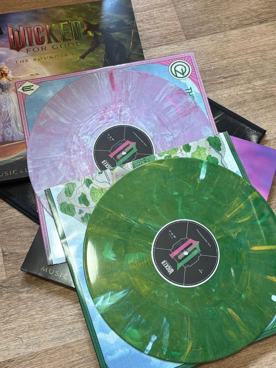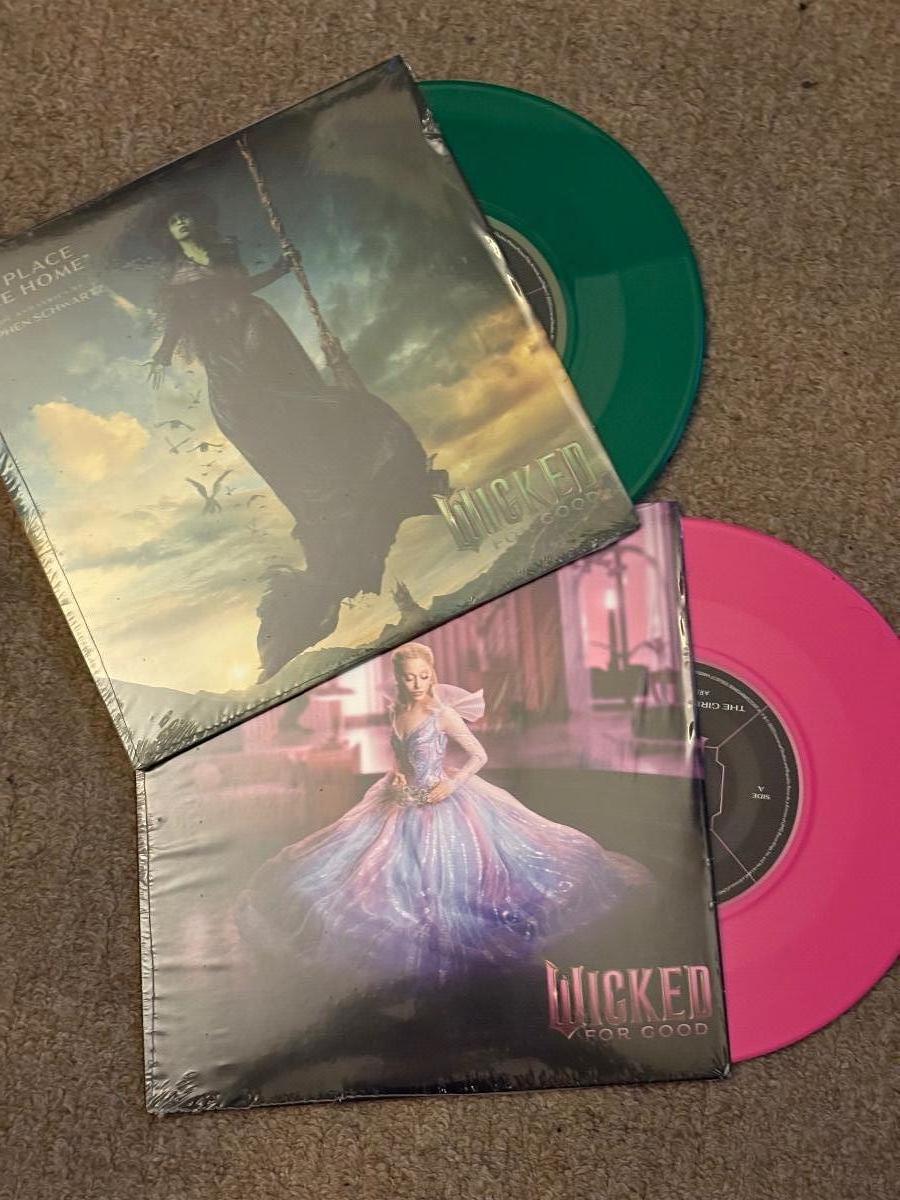 Wicked For Good vinyl bundle including double coloured vinyl limited edition, double black vinyl edition, plus three coloured vinyl 7” … There’s No Place Like Home, Girl in the Bubble and Defying Gravity plus a Wicked promo bag.