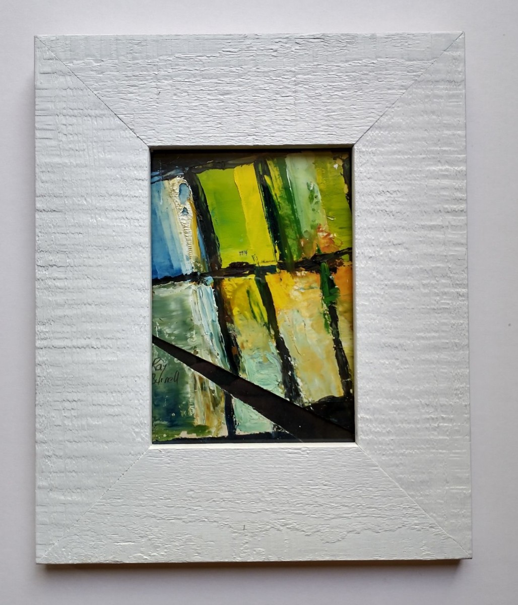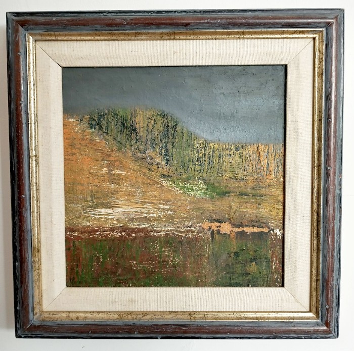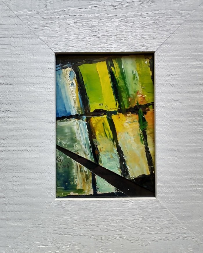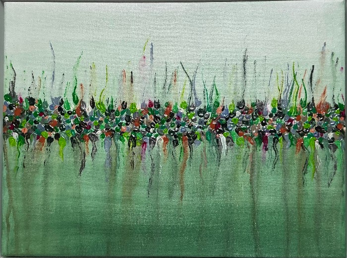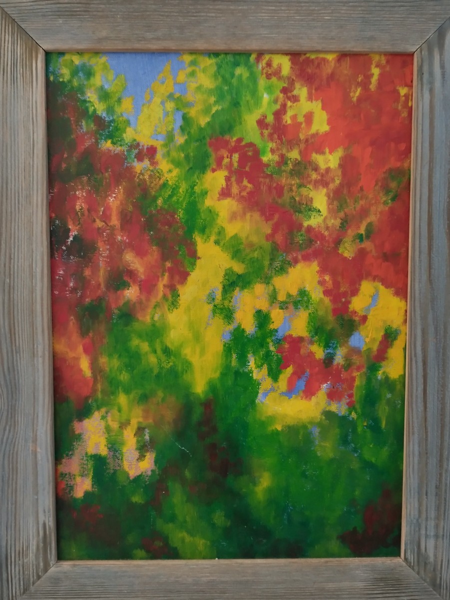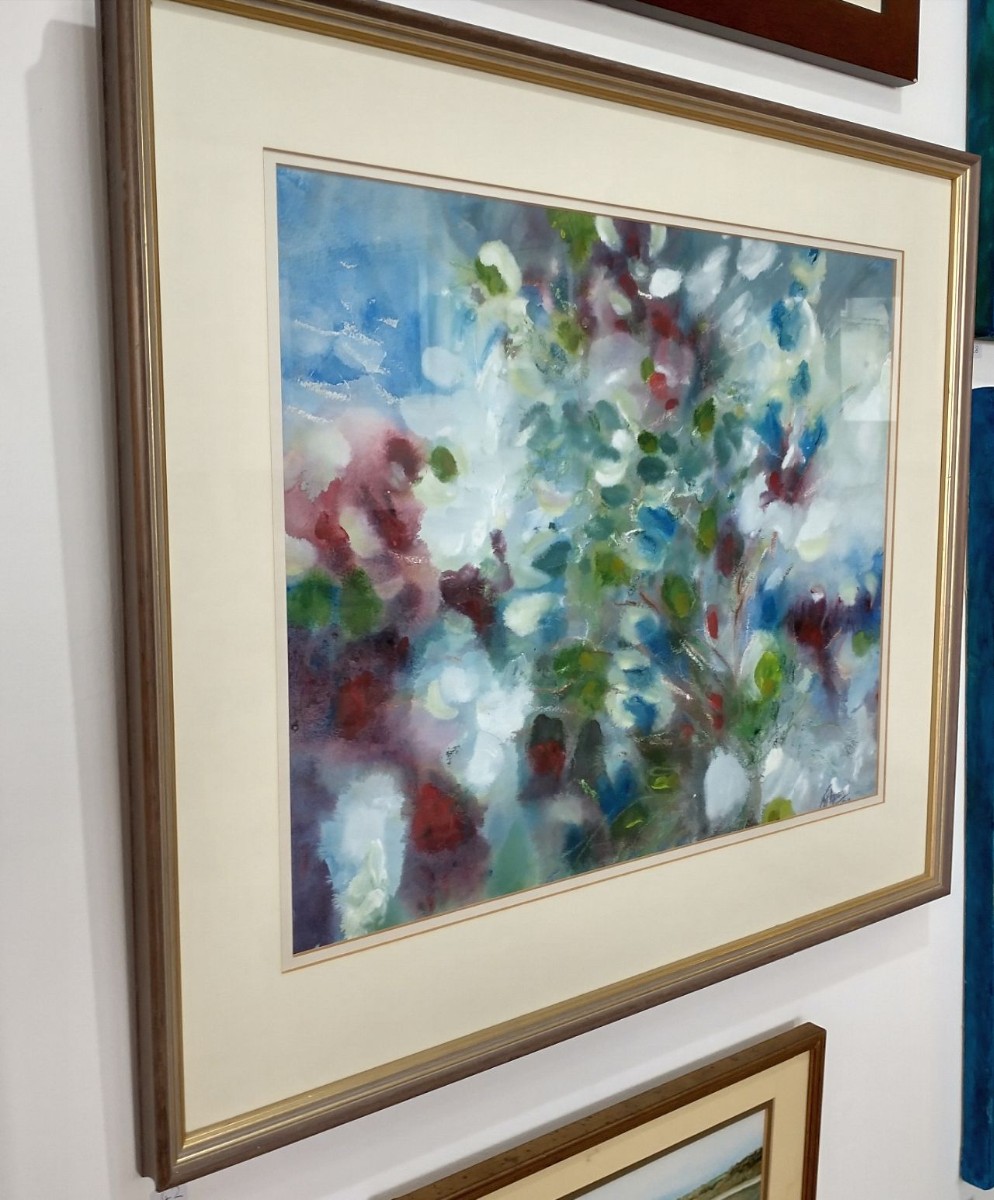 Oil on Canvas 30cm x 25cm - framed. 37cm x 32 cm My primary source is found in the intoxication of informal gardens and of light falling through foliage or on water. The paintings are the physical metaphors for these experiences. I paint mainly in oil paint or watercolour and occasionally acrylic. The different properties of each medium lend themselves to different approaches extending the vocabulary I can draw upon. All the paintings should be immersive work and without a particular focal point, much as we scan in real life. I use mixed colours, rhythm, shallow depths and use a ‘dry on dry’ technique that encourages a 'calligraphic' brushwork.