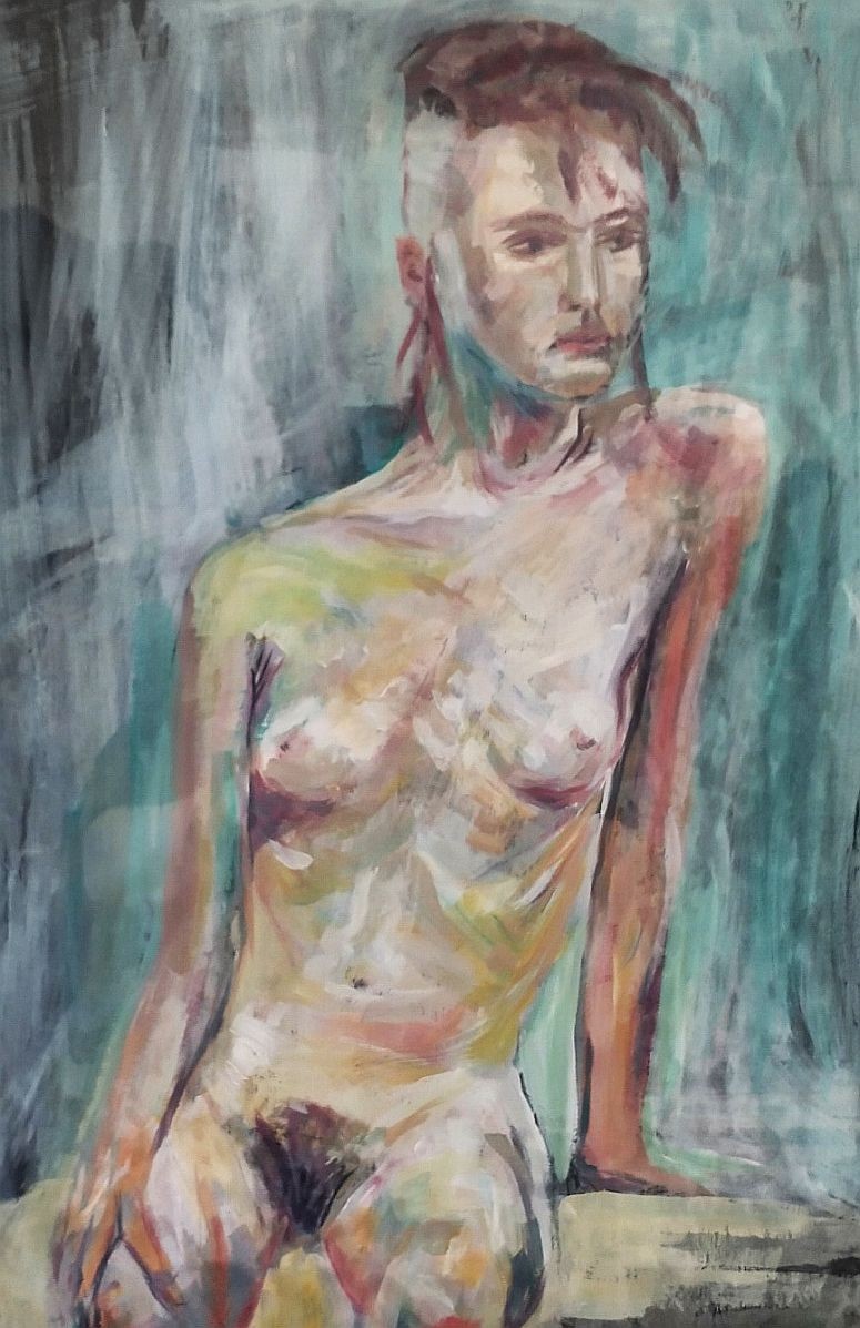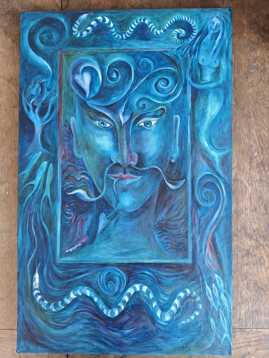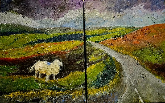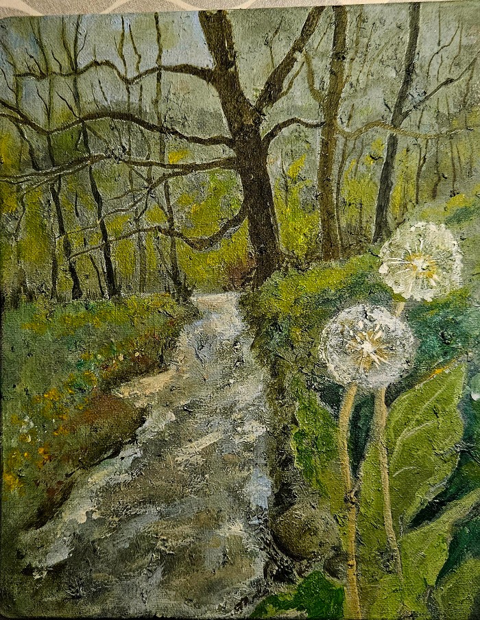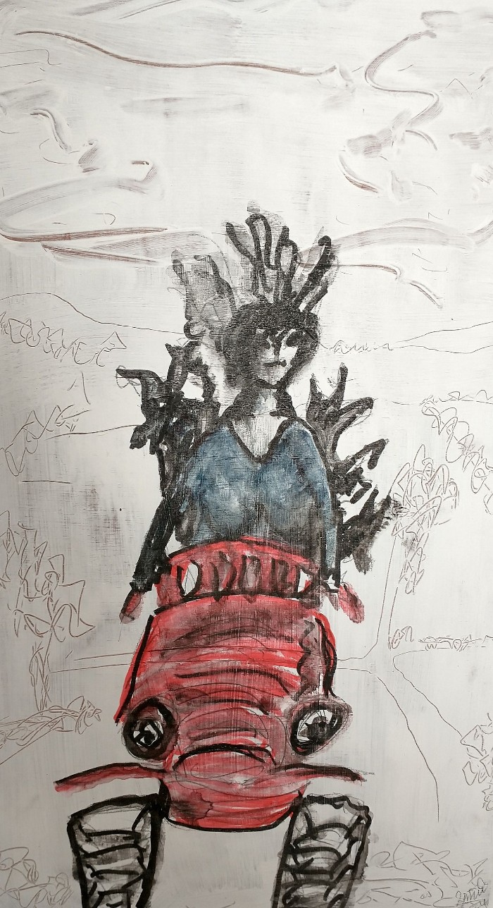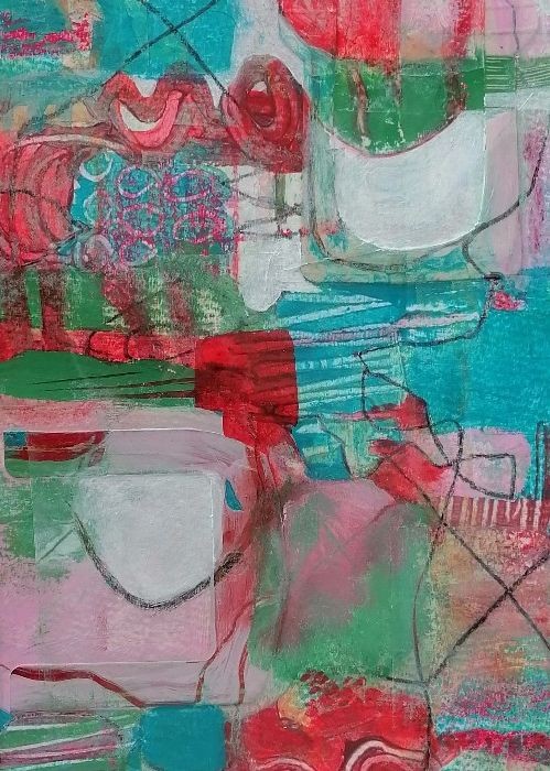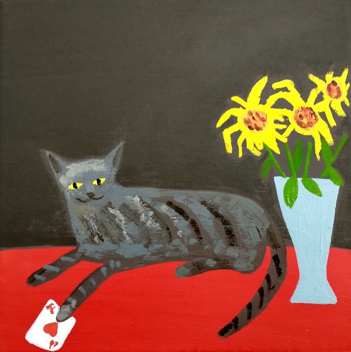 oil on canvas 20x20cm Jacqueline is a painter from Porth near Tonypandy Rhonda Cynon Taf. Recently she exhibited with the Mall Galleries in London but is fairly well known in Wales as part of the Welsh Group and a member of the Stuckist Movement. Her work is exhibited internationally from America to Tehran. She describes her work as Figurative/ expressive but it is worth mentioning the Stuckist manifesto at this point where there is a quest for authenticity with uncensored expression. Stuckists promote the medium of self-discovery fully immersed in the process of action, emotion, thought and vision. And a holistic approach where there is a meeting of the conscious and unconscious , thought and emotion, spiritual and material, Private and public.