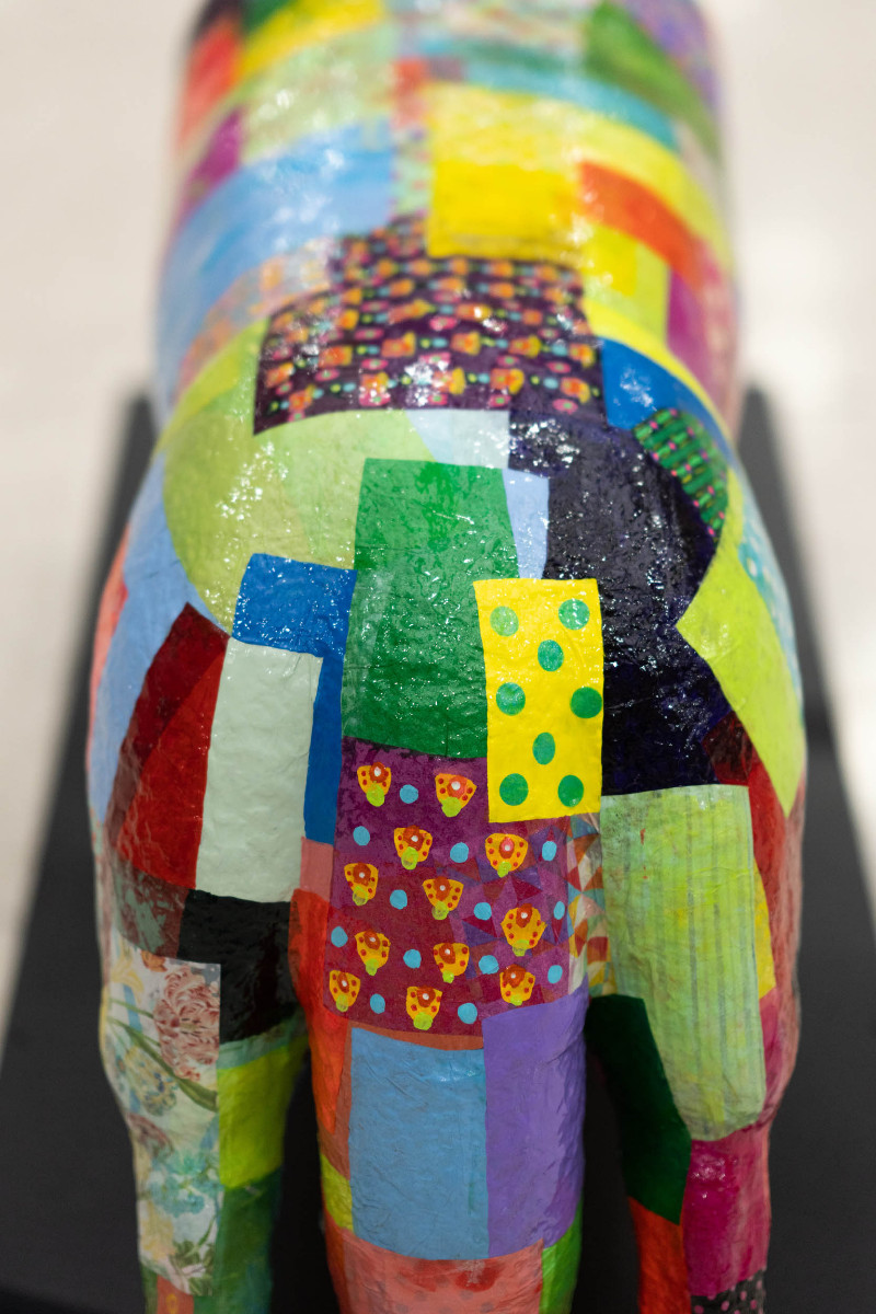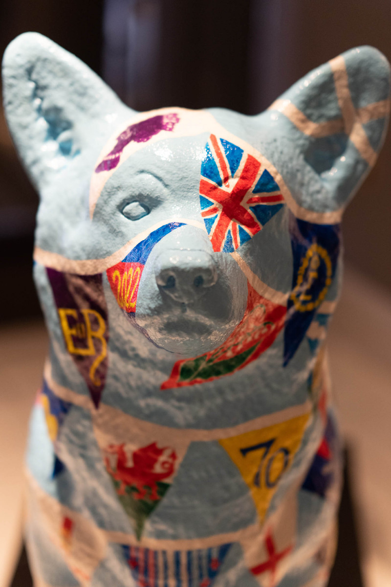Inspiration & Process: This piece is inspired by the places Her Majesty has visited during her reign. The Corgi has a jacket made of 7 stripes, one for each decade of her reign. Abstract shapes reference locations visited, whilst the colours are inspired by her outfits from each decade.