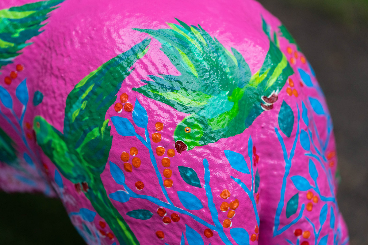 "in honour of her lifelong love..." Rebecca's design for this Corgi plays homage to the Queen's relationship with flowers during her reign. Throughout her reign, flowers have been significant at land marking historical moments. Flowers universally symbolise love, respect and loyalty and with their vibrancy of colour and variety of shapes they are the perfect visual to draw upon when celebrating not only the Queen's long standing love affair with the Corgi, but also the Queen and her dedication to the Crown.