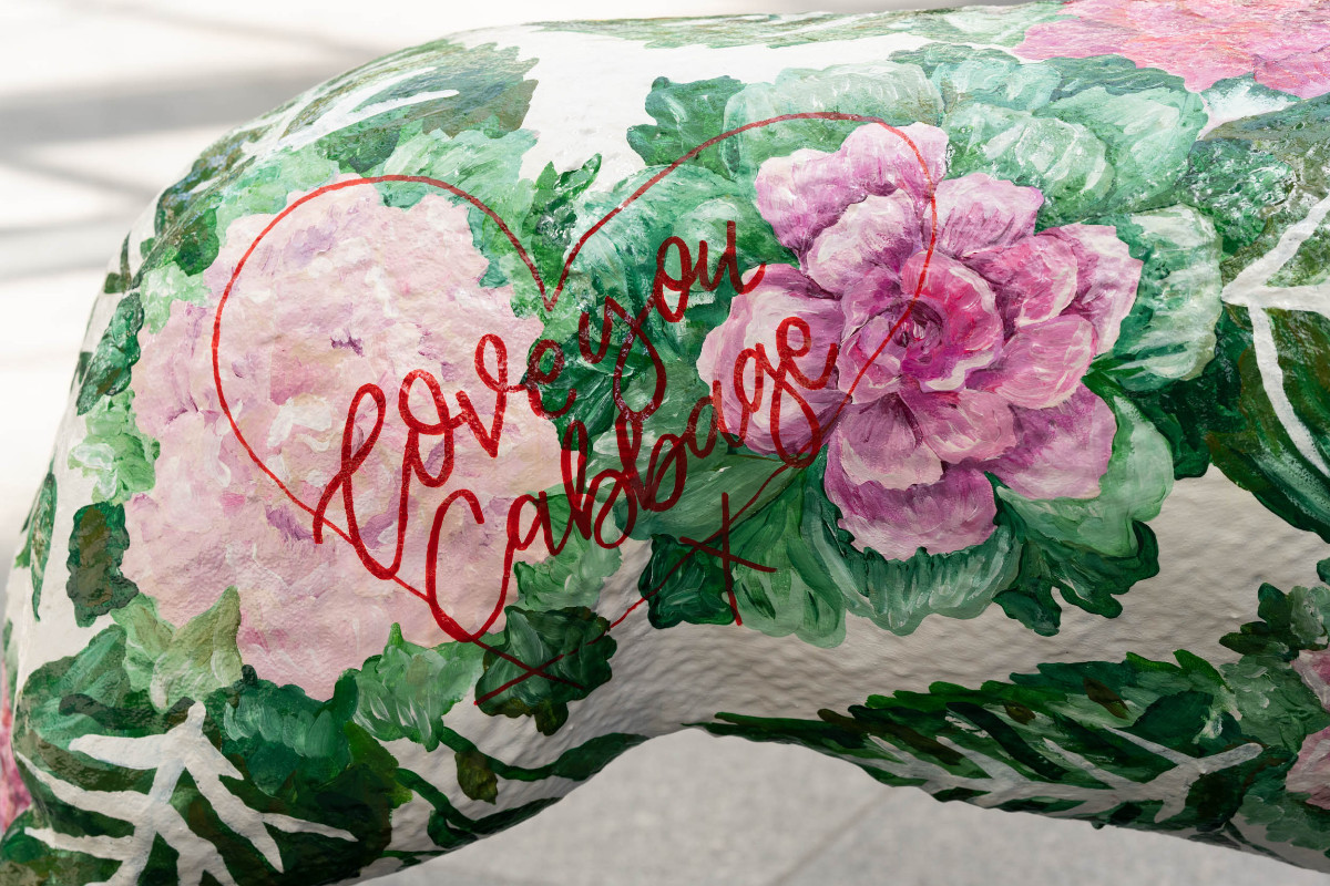 Inspiration & Process: HannDrawn has a passion for painting floral and botanical art and wanted to use her floral style combined with the love story of the Queen and Prince Philip. Prince Philip's nickname for the Queen was Cabbage and she wanted to portray this love story over the corgi, painting beautiful cabbage flowers. On top of the cabbages, HannDrawn wrote love messages in calligraphy showing their devotion to one another with other nicknames they had for each other.
