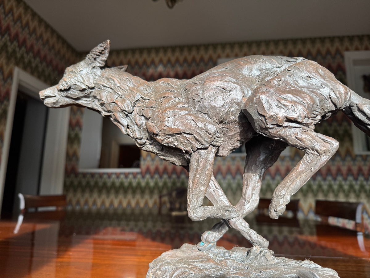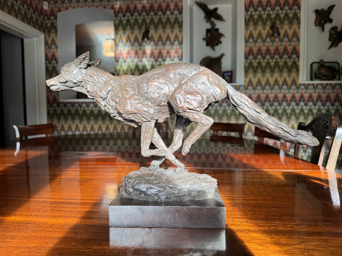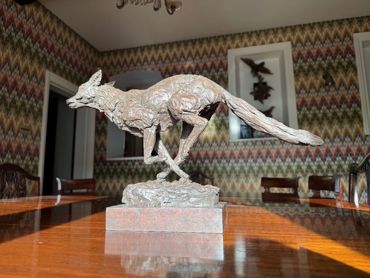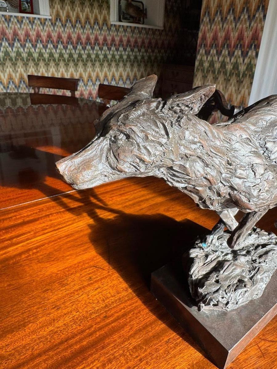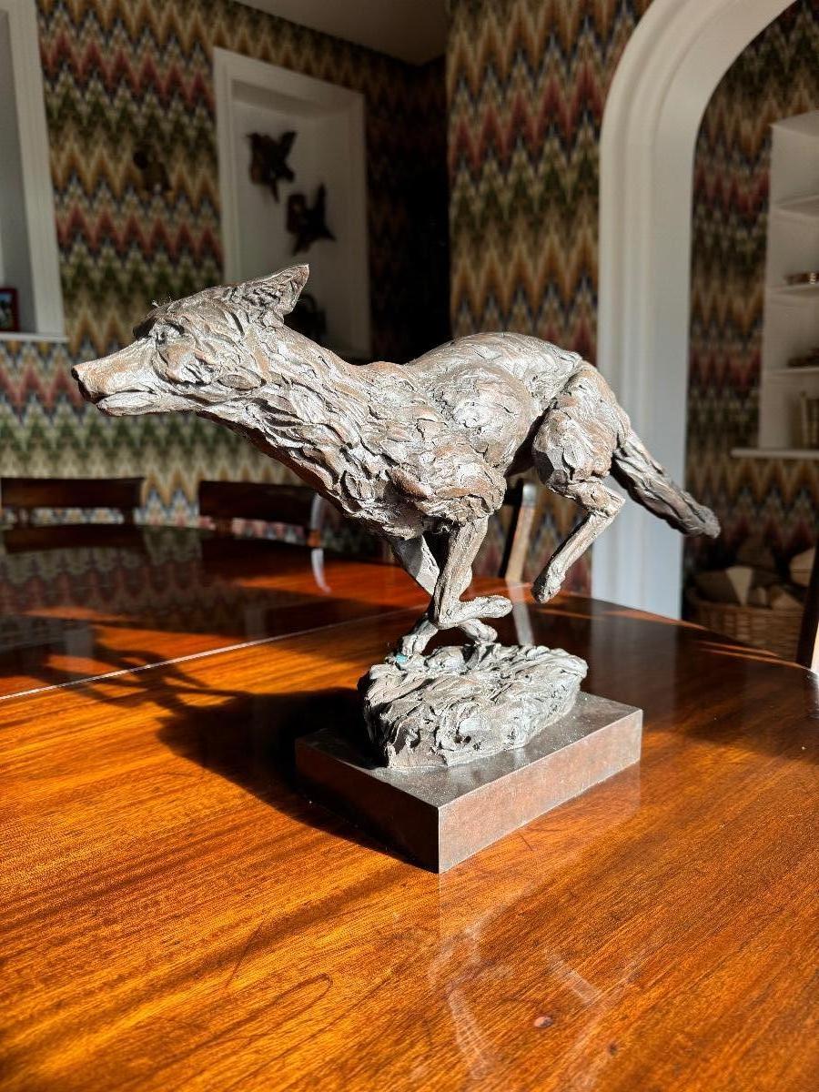 A unique opportunity to acquire number 5 of a limited edition of 6 of Emma’s Portman Fox. Measures nose to tail 21.5 inches, and top of base to back 12 inches. Cast in bronze so wonderfully heavy. Please come to the tent to see it (under surveillance!) and marvel for yourself how alive and on the run it feels. Energy rippling through its limbs.