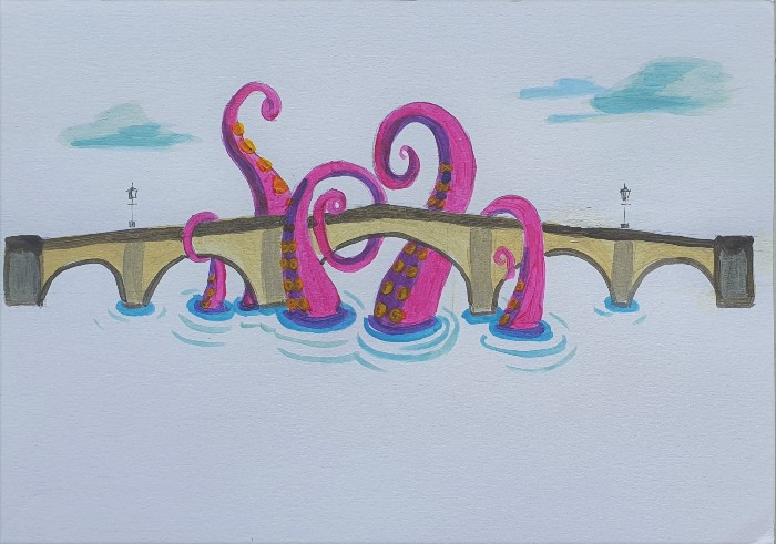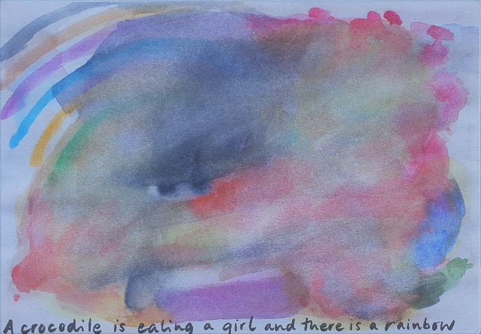 A Crocodile is Eating a Girl and There Is a Rainbow