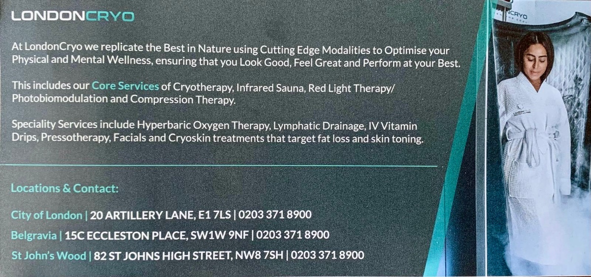 £200 Gift Card for London Cryo - locations in City of London (Artillery Lane), Belgravia (Eccleston Place) and St. John's Wood (St. John's Wood High Street).