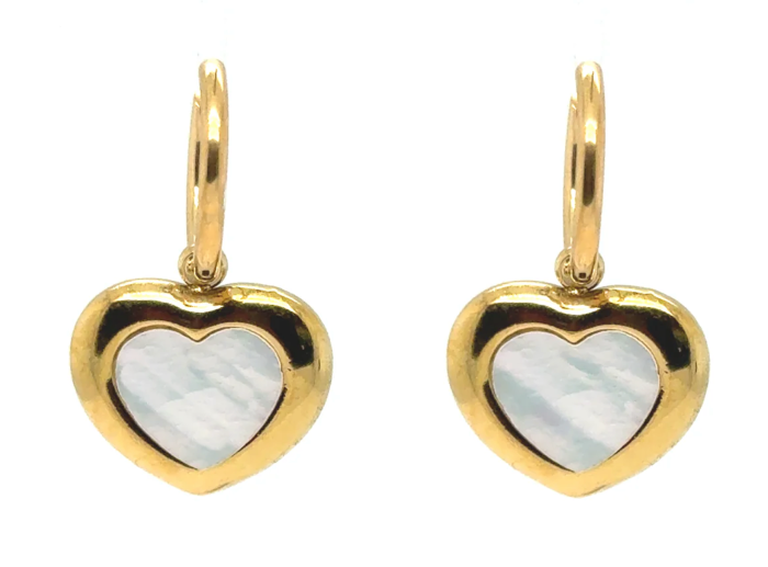 gold hoop earrings with mother of pearl and gold heart charms